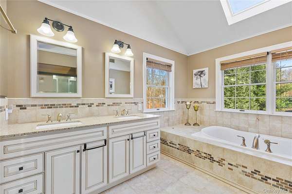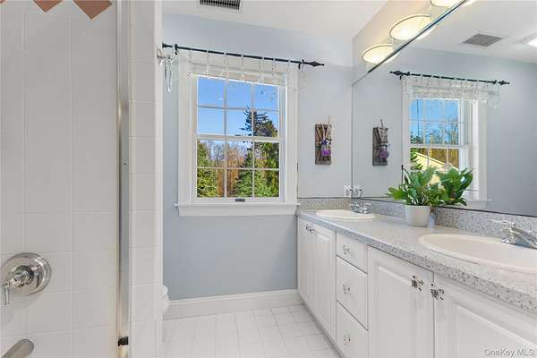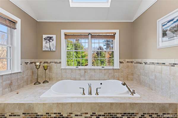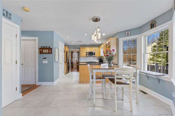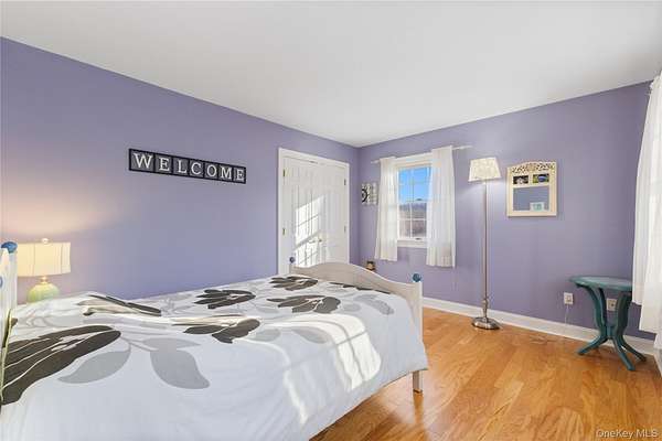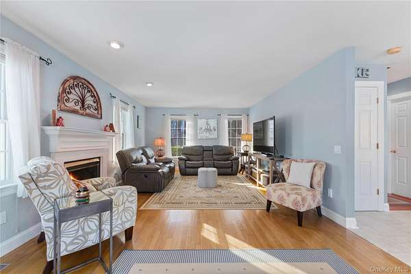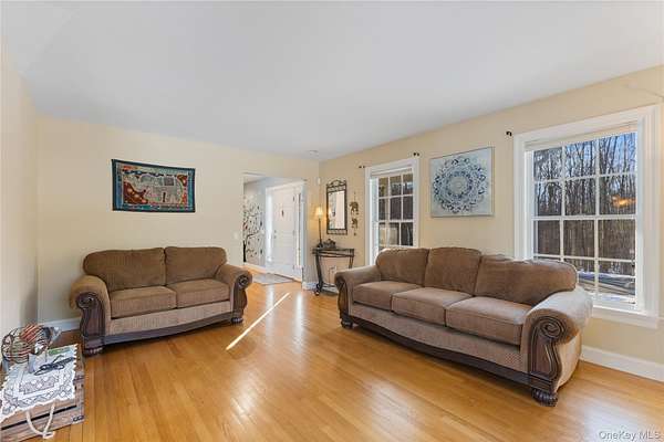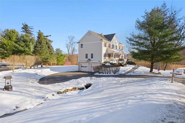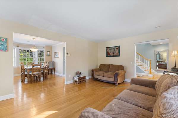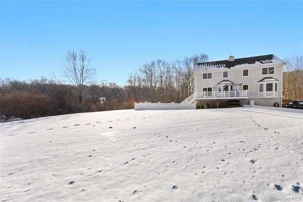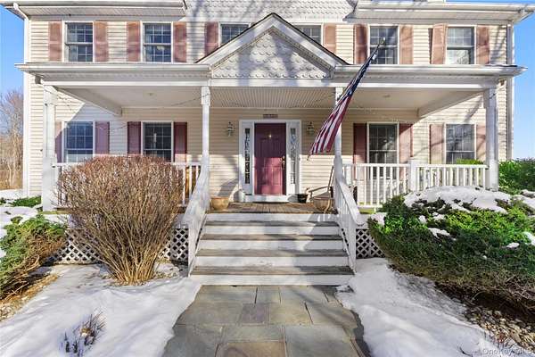 Welcome to this Pristine 3 Bedroom, Plus Sitting Room, Front Porch Colonial, ideally located in a desirable neighborhood and set on 2.78 acres of beautiful, level property. A welcoming front hall with hardwood floors throughout leads into a sun-filled eat-in kitchen featuring quartz countertops, tiled backsplash, stainless steel refrigerator, and gas stove. The kitchen flows seamlessly into the inviting family room, highlighted by a wood-burning fireplace and sliding glass doors that open to a private deck overlooking the expansive backyard-perfect for entertaining or relaxing. A spacious dining room sits conveniently off the kitchen and transitions effortlessly into the formal living room. A half bath completes the main level. Upstairs, you'll find two well-sized bedrooms with hardwood floors and abundant natural light, along with a full hall bath with a tub/shower combination. The primary suite is a true retreat, featuring a tray ceiling, walk-in closet, and a large sitting room with two additional double-door closets, offering flexible space for an office, nursery, or lounge. The primary ensuite bath includes double sinks, a whirlpool tub, and a separate walk-in shower. The finished lower level provides versatile additional living space and features French doors leading to a fully fenced side yard. The laundry room is also located on this level, along with direct access to the two-car attached garage with epoxy flooring. This home is also equipped with a central vacuum system for effortless maintenance. Conveniently located near highways, schools, parks, bike path, shopping, train and more, this turn-key home offers space, comfort, and location. Don't miss the opportunity to make it yours! If you'd like to see a 3D tour of this home, there is one here: