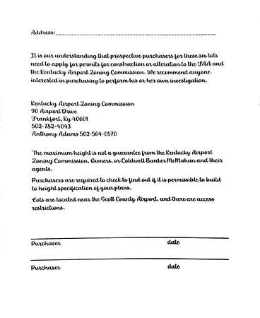 Est $1,542/moThis 5 acres is ready to build your dream home. The successful buyer will need to get their house plans approved by the Kentucky Airport Zoning Board in Frankfort for the height restrictions. Purchasers are required to check to find out if it is permissible to build to height specifications of your plans. The lot is near the Scott County Airport and there are access restrictions. The Kentucky Airport Zoning Board is There is no HOA and attached are the Hyde Park Subdivision Protective Covenants.