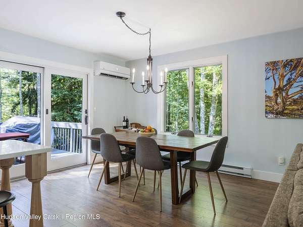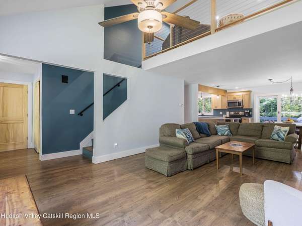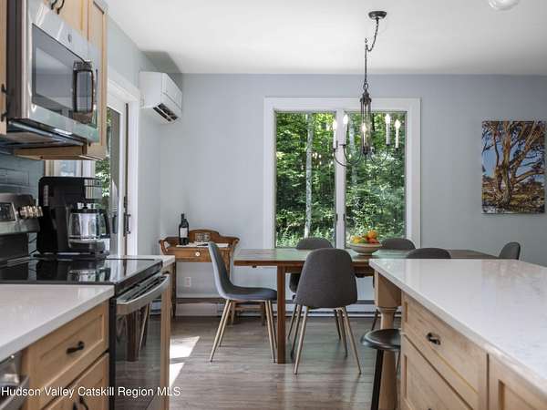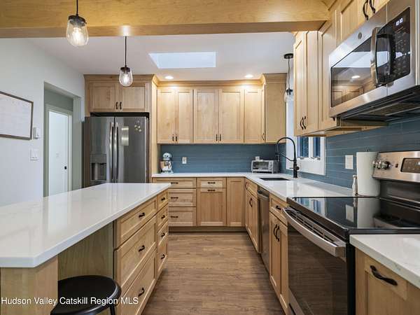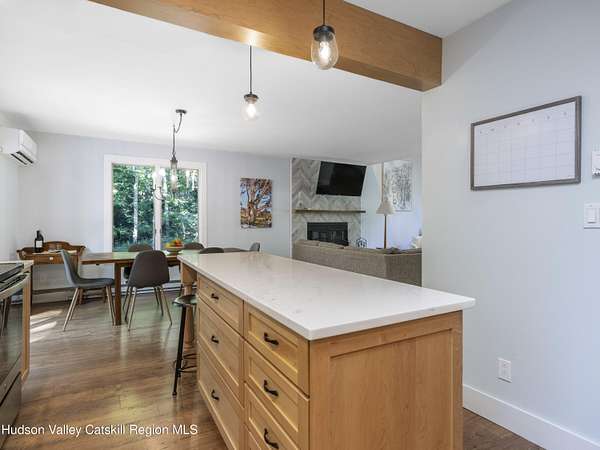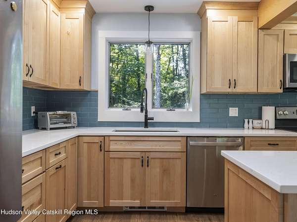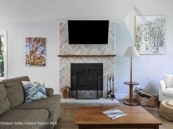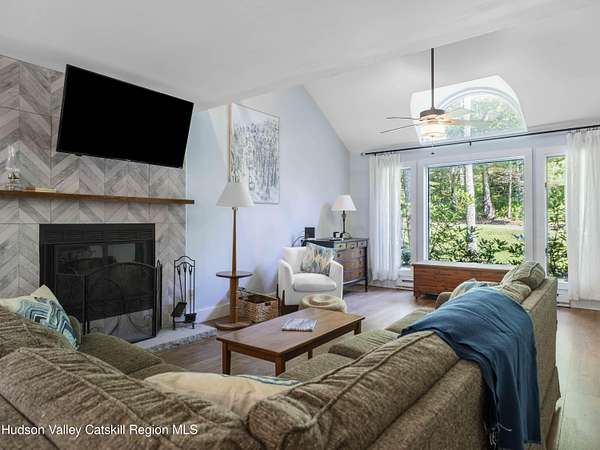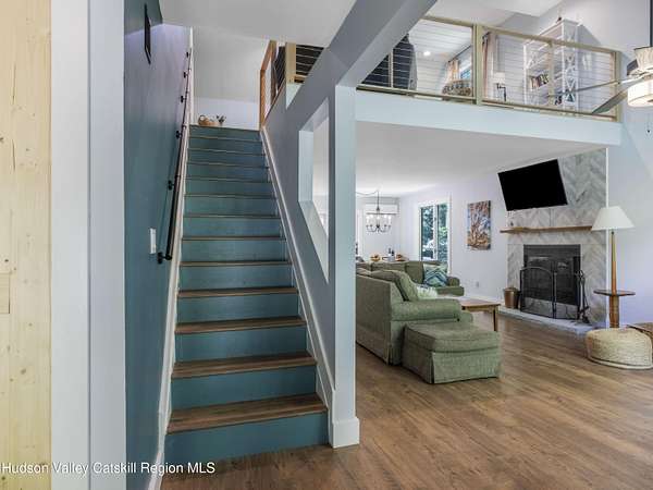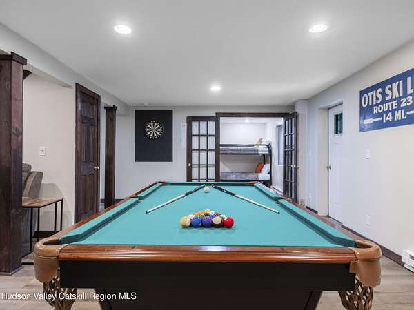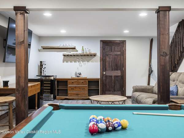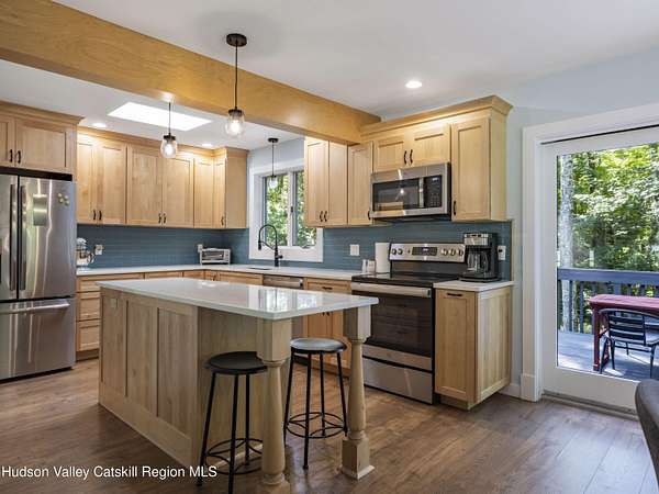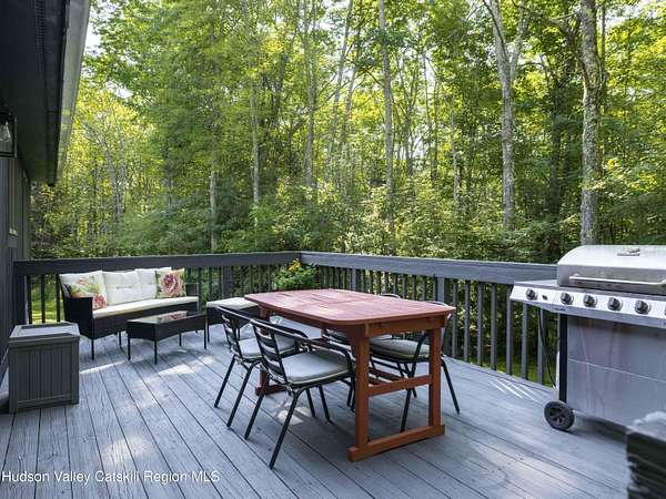 Cozy Up in This Fully Renovated Mountain Home- Just in Time for Fall Colors and Winter Skiing! Welcome to your serene mountain retreat-fully renovated, turnkey, and ready for you to enjoy this fall's vibrant foliage and hit the slopes at Windham or Hunter Mountain this winter. Whether you're looking for a peaceful full-time residence, a weekend escape, or a strong-performing short-term rental, this modern Catskills home checks every box. Tucked away on 5 private, wooded acres that back up to DEP-protected land, this spacious three-level home blends clean, contemporary style with the comforts of mountain living. Step inside to calming interior tones-soft grays and crisp whites-enhanced by new, modern light fixtures throughout. The warm yet modern palette sets a peaceful tone, while one of the bedroom walls features a fun and tasteful accent color that adds personality without overwhelming the space. The open-concept main floor welcomes you with vaulted ceilings, gleaming wood floors, and a dramatic wood-burning fireplace framed in eye-catching herringbone tile. The layout flows effortlessly into a chef's kitchen outfitted with white quartz countertops, stainless steel, GE appliances, custom maple cabinetry, and an island with additional storage space below. Just off the dining area, sliding doors open to a freshly painted deck-ideal for grilling, entertaining, or sipping your morning coffee while soaking in the surrounding nature. Also on the main level: two comfortable bedrooms and a fully updated bathroom with a brand-new double vanity. Upstairs, a private primary suite awaits with a renovated en-suite bath featuring a tiled walk-in shower, and rustic barn door detail. Adjacent is a spacious loft overlooking the living area below, complete with built-in cabinetry, a custom desk, and sleek cable railings-a perfect space for a home office, reading nook, or additional sleeping area. The fully finished walk-out basement adds even more flexibility, offering a large family/game room, a bunk room, and a brand-new third full bathroom. The pool table stays for instant fun, and most furnishings are available, making this a truly move-in-ready home with excellent rental potential. Split AC units and ceiling fans keep things cool in the summer, while the fireplace adds cozy ambiance during the winter months. A two-car garage provides plenty of storage for all your gear-whether it's skis, bikes, or kayaks. Outside, enjoy a dedicated fire pit area and a small garden space-the lush lawn provides the perfect space for stargazing, s'mores, or morning meditation. With a newer roof (approx. 7 years old) and every corner thoughtfully updated, this home offers peace of mind along with its charm. Located just minutes from Windham and Hunter Mountains, public golf courses, parks, hiking trails, and Windham's shops and dining, it's the ideal base for year-round adventure. This Catskills gem is more than a home, it's your next chapter! Call/Text today to schedule an in-person viewing!