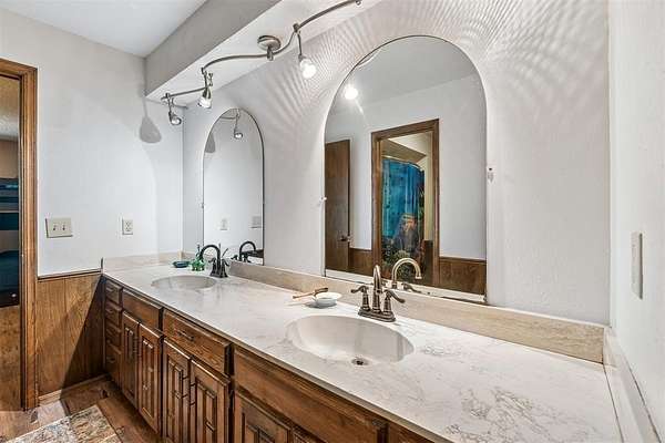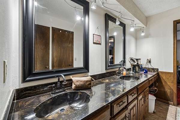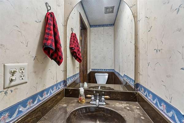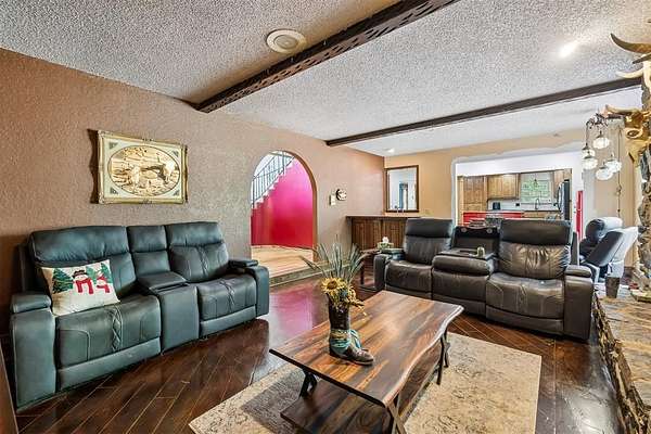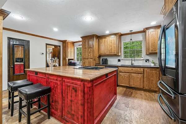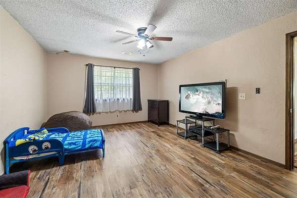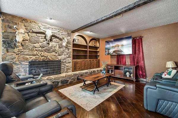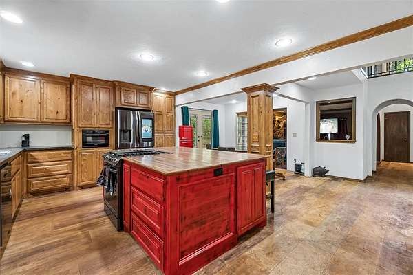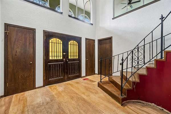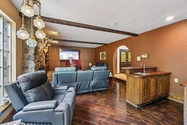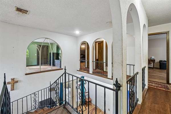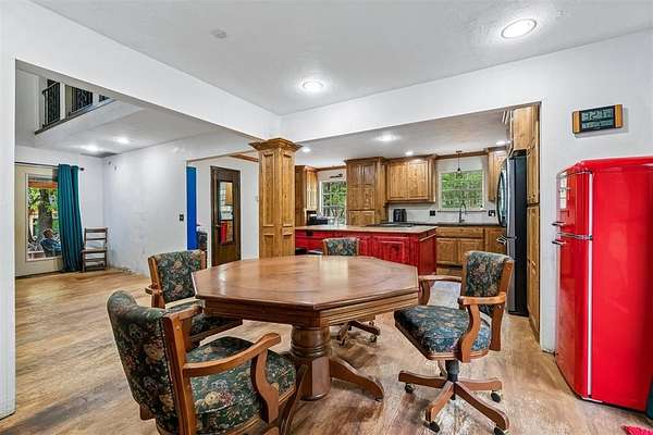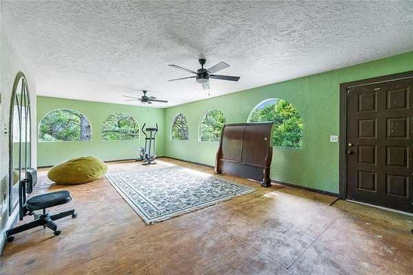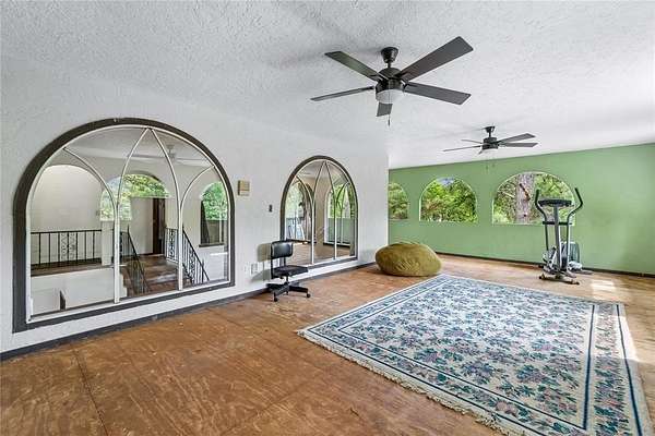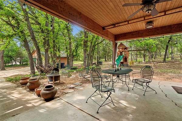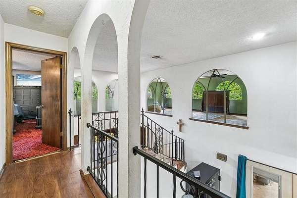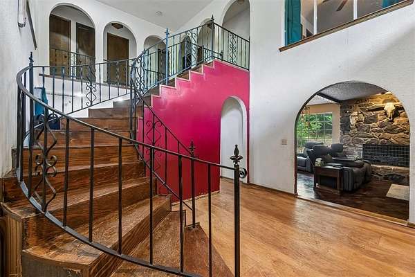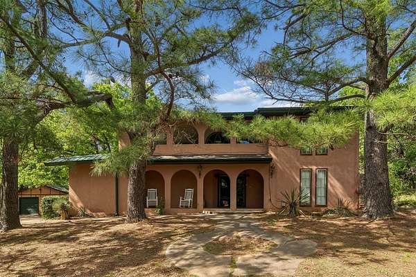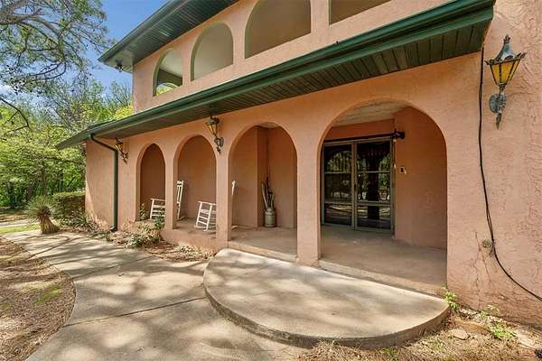 Step into timeless elegance with this stunning Mediterranean-style home featuring classic Spanish architectural details, perfectly situated on 4.7 beautiful treed acres with a pond. Offering 2,718 sq ft, this custom home includes 3 bedrooms, 2.5 bathrooms, 2 living areas, a 2-car garage, and an additional 2-car shop-ideal for hobbies, storage, or extra workspace. Inside, you'll find a warm and inviting layout filled with character, including arched doorways, a grand curved staircase with wrought iron accents, and thoughtfully designed living spaces. The spacious living area is highlighted by a beautiful gas log stone fireplace, creating a cozy yet elegant focal point. The home is equipped with zoned heating and air along with two hot water heaters for comfort and efficiency. Step out back to one of the home's most impressive features-a covered veranda and balcony with arched openings overlooking the property, providing the perfect place to relax and take in the peaceful setting. Surrounded by mature trees and a scenic pond, this property offers privacy, space, and a true connection to nature. This one-of-a-kind property blends timeless architecture, modern comfort, and acreage living-a rare opportunity you won't want to miss.