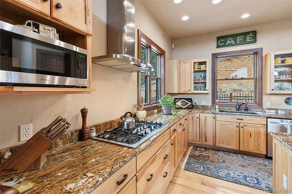 Inside, rich hickory hardwood floors and radiant in-floor heating guide you from an impressive 9-foot custom entry door into a breathtaking great room, where soaring vaulted wood ceilings and a grand stone gas fireplace create an atmosphere of refined alpine elegance.