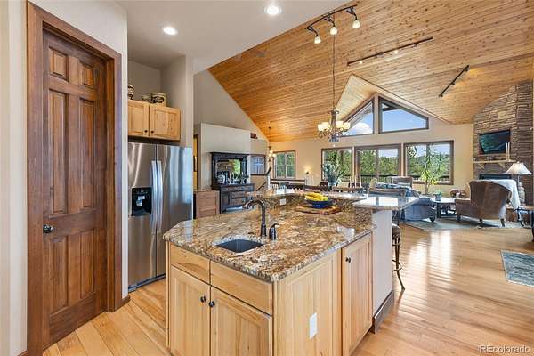 Outdoors, the property borders over 5,000 acres of pristine federal land, offering unmatched privacy and connection to nature. Tranquil water features, including a pond, complement low-maintenance decking and artistic, bear-carved tree stumps, creating a serene and distinctly Colorado alpine setting.