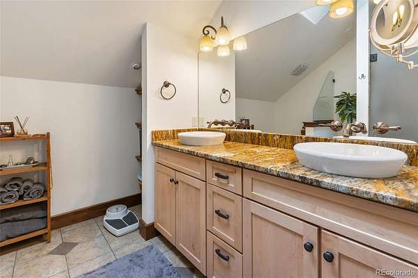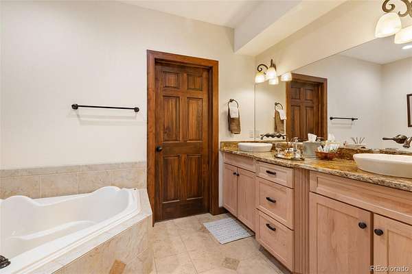 The main-level primary suite is a true retreat, complete with a luxurious dressing room, elegant sitting area, and walls of windows designed to capture unobstructed, panoramic views of Pikes Peak in all its grandeur.