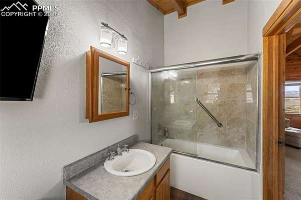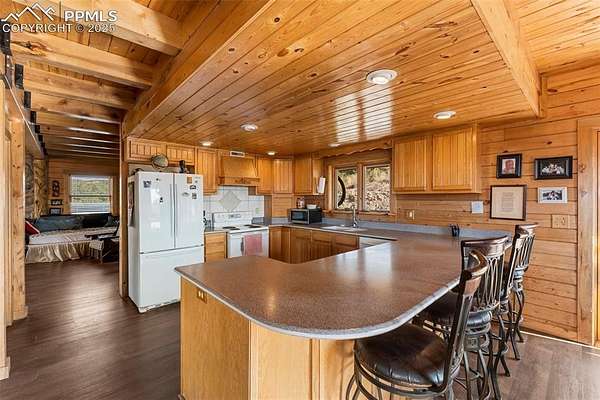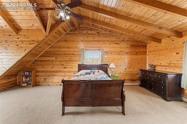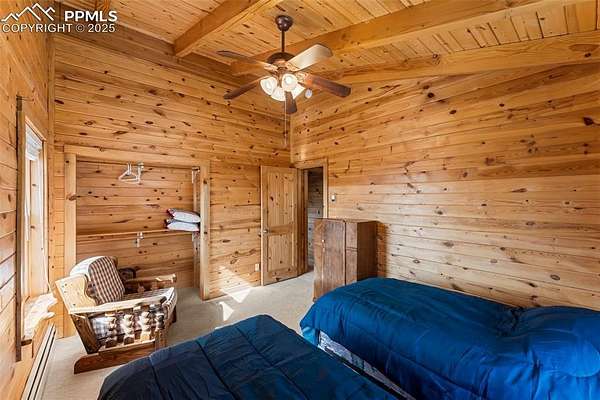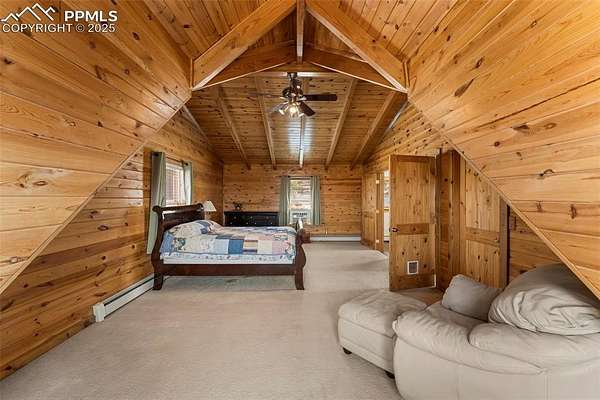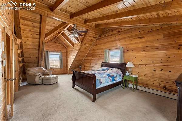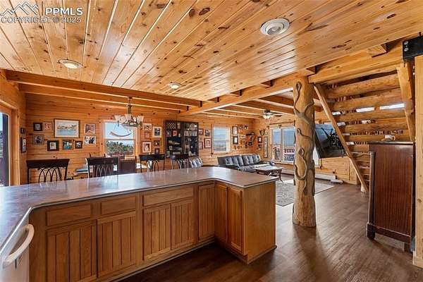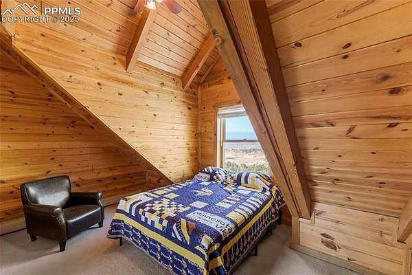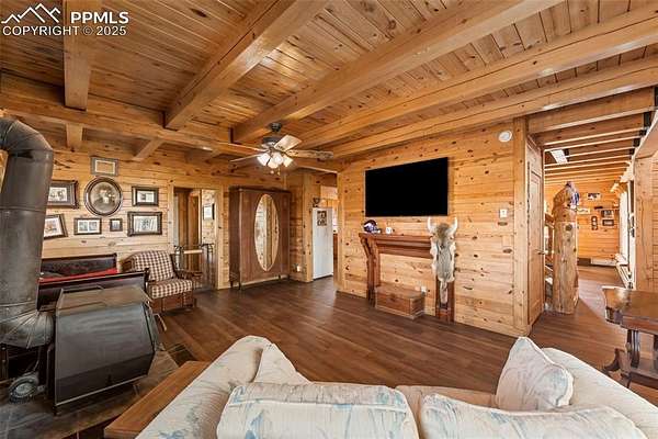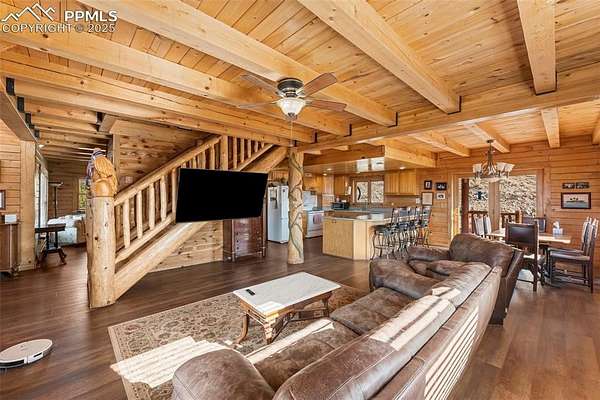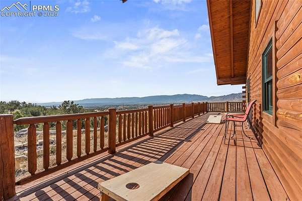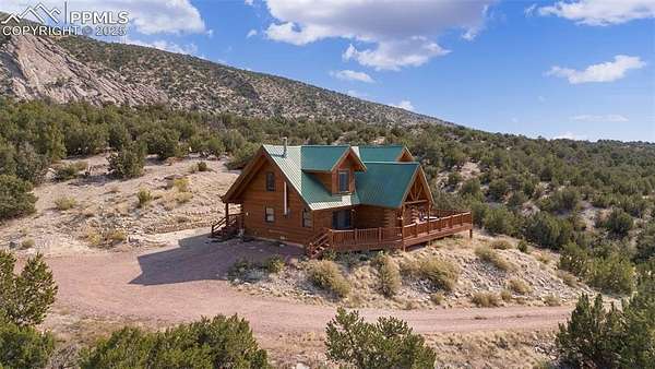 Nestled in the heart of rugged mountain terrain, this charming log cabin sits on an expansive 43-acre lot, offering the perfect blend of rustic elegance and modern comfort. The property backs up to BLM land, providing an unparalleled sense of privacy and endless opportunities for outdoor adventures right in your backyard. The exterior showcases an expansive wraparound deck that invites you to take in the breathtaking panoramic views of the Sangre De Cristo Mountains. Inside, the home exudes warmth with its rich wood finishes, exposed beams, and custom woodwork throughout. The open-concept living space is flooded with natural light, creating an inviting atmosphere ideal for both relaxing and entertaining. The living room, complete with a cozy wood stove set against a natural stone backdrop, is perfect for unwinding after a day of exploring the great outdoors. Equipped with modern amenities, the kitchen offers ample counter space, and a large island for meal preparation, catering to both casual and formal dining experiences. Upstairs, the spacious master bedroom features vaulted ceilings, large windows that frame stunning mountain views, and an en-suite bathroom for added privacy and comfort. The other two large bedrooms on the upper-level offer all the space you will need to house multiple guests to enjoy your mountainous getaway with you. Whether you're seeking a full-time residence, a vacation getaway, or a rental opportunity, this secluded retreat on 43 acres offers the ultimate mountain escape without sacrificing modern-day comforts. Don't miss the chance to own your personal piece of mountain paradise-schedule a tour today!