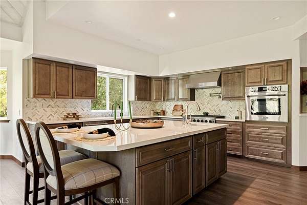 Step inside to soaring vaulted ceilings with rustic beams, wide-plank flooring, and a dramatic stone fireplace anchoring the great room -- a space made for cozy evenings and framed by panoramic windows overlooking the treetops. The open-concept floor plan flows effortlessly into an entertainer's kitchen featuring a grand quartz island, herringbone backsplash, custom cabinetry, and high-end stainless steel appliances including a 6-burner range and wall oven. The dining area captures beautiful natural light and forest views, creating the perfect setting for family gatherings or dinner parties.