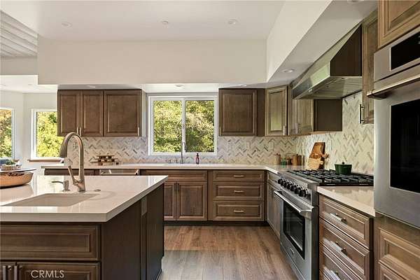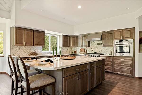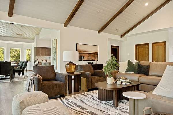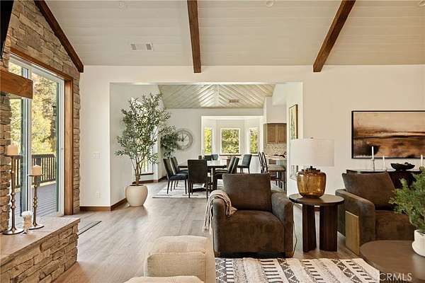 Step inside to soaring vaulted ceilings with rustic beams, wide-plank flooring, and a dramatic stone fireplace anchoring the great room — a space made for cozy evenings and framed by panoramic windows overlooking the treetops. The open-concept floor plan flows effortlessly into an entertainer’s kitchen featuring a grand quartz island, herringbone backsplash, custom cabinetry, and high-end stainless steel appliances including a 6-burner range and wall oven. The dining area captures beautiful natural light and forest views, creating the perfect setting for family gatherings or dinner parties.