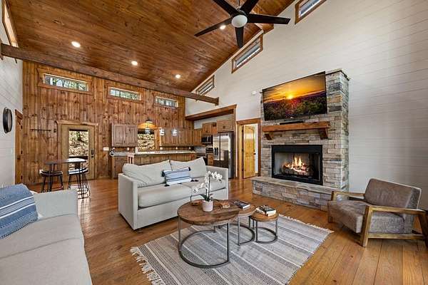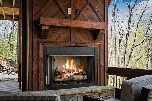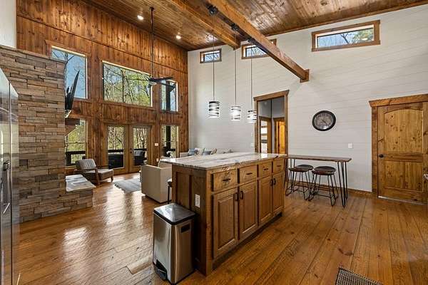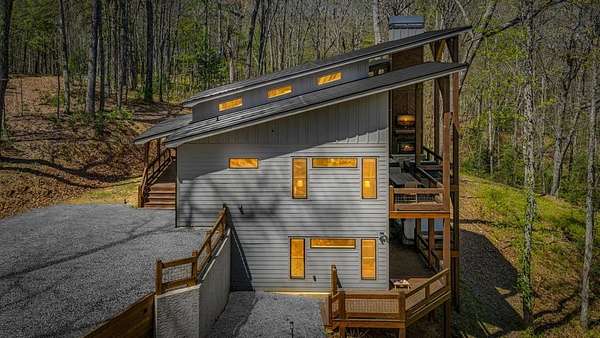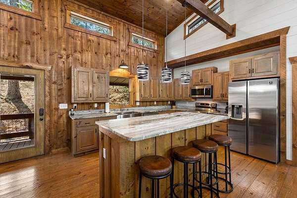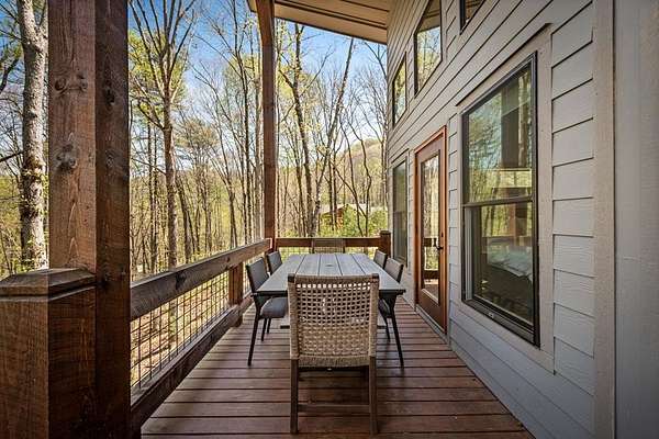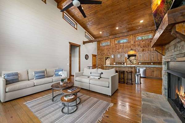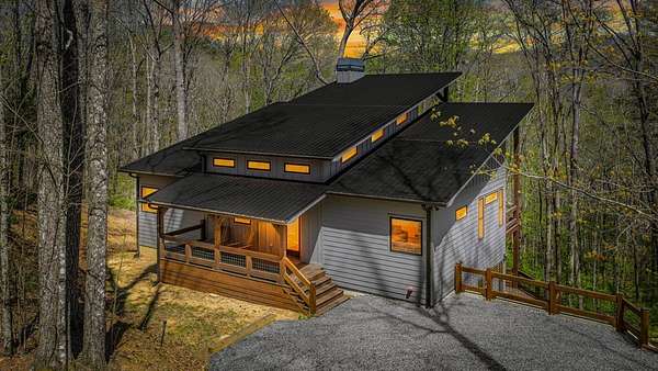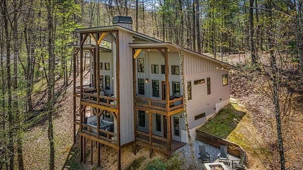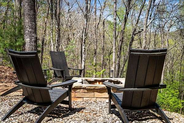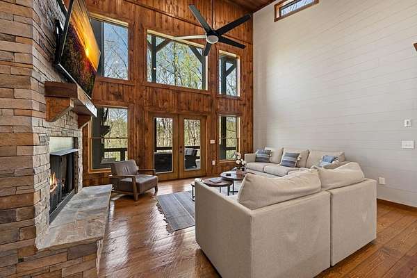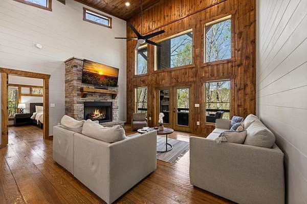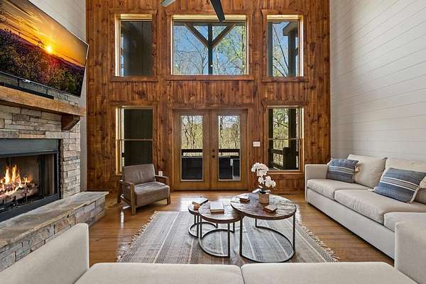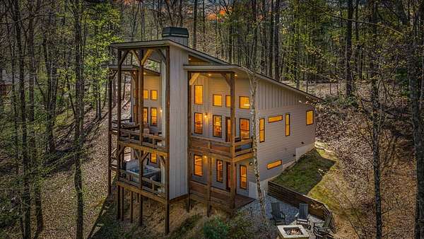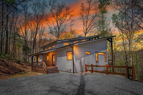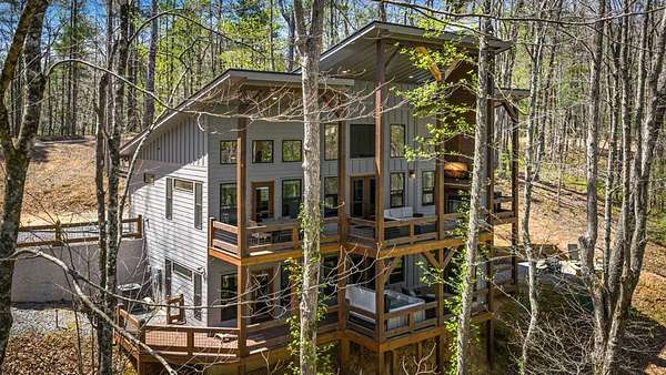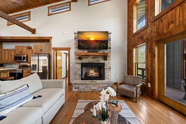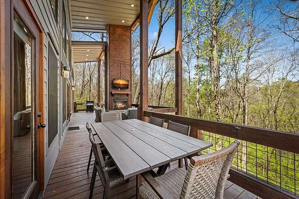This rustic modern mountain cabin with seasonal mountain VIEW is the total package!Selling Turn Key FURNISHED—This 4 bedroom, 3 bath cabin has been lightly used and impeccably maintained, offering the rare opportunity to own a like-new home without the wait. Designed to impress the open-concept floor plan features wide plank wood floors, soaring cathedral ceiling and dramatic wall of windows that floods the great room with natural light while framing the mountain view. With 3 king-size bedrooms plus a fun bunk room, there's plenty of space to comfortably sleep 10, making it ideal for hosting family and friends or maximizing rental potential. Two luxurious ensuites on the main level offer convenience and privacy, while two full levels of living provide room to spread out and unwind. The finished terrace level is an entertainer's dream with a spacious family / recreation room complete with a wet bar—perfect for game nights and gathering after a day of adventure. Step outside and experience true mountain living with two levels of covered porches, each featuring its own outdoor fireplace, creating the perfect setting for year-round enjoyment. Relax in the hot tub, gather around the firepit, and soak in the peaceful surroundings. Located in the highly sought-after Cherry Log area, conveniently positioned between Ellijay and Blue Ridge, you're just minutes from favorites like Roo Mountain Vineyards, Bear Claw Vineyards, Cress Creek Farm, and endless outdoor adventures including hiking the Benton MacKaye Trail, mountain biking, and horseback riding. And unlike many mountain homes, this one offers EASY access with no steep or scary driveway and plenty of parking—a rare and valuable feature for both everyday living and guests. Whether you're looking for a private mountain escape, a full-time residence, or an income-producing investment, this stunning cabin delivers the lifestyle—and memories—you've been dreaming of.