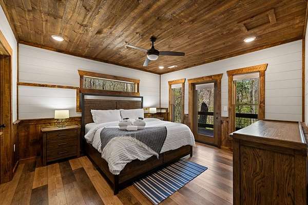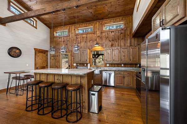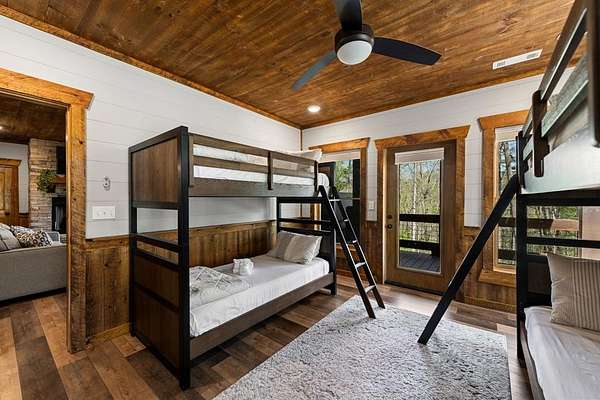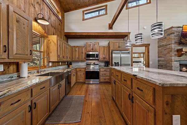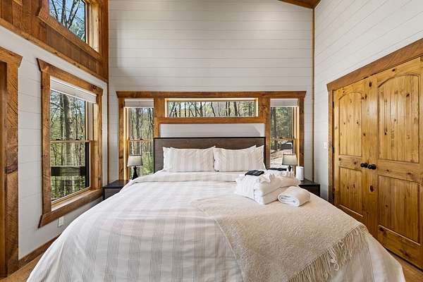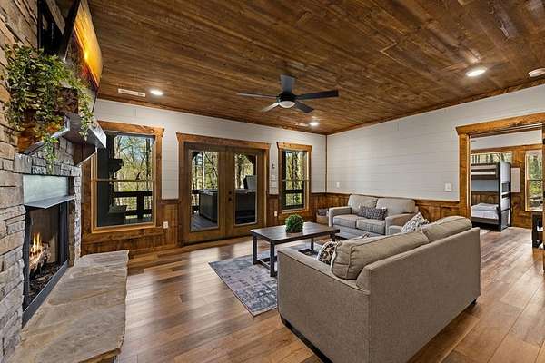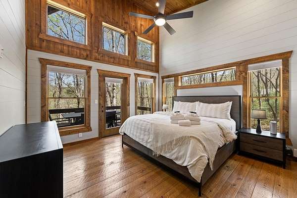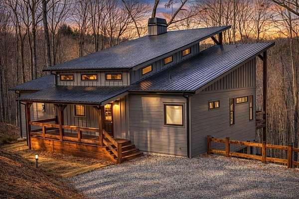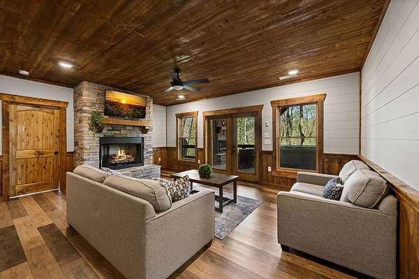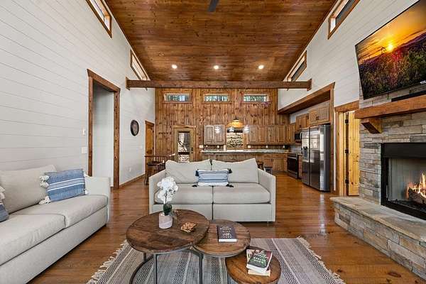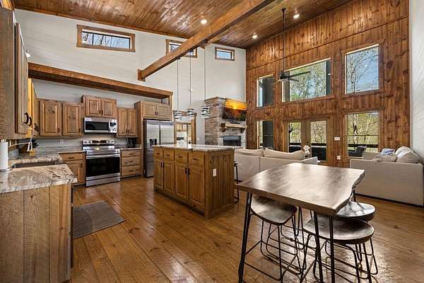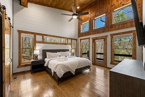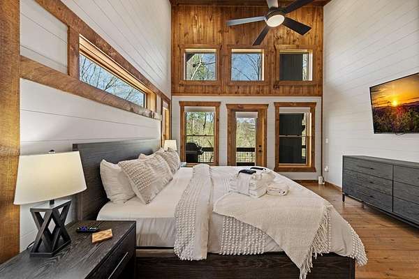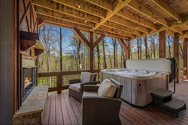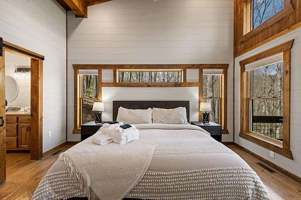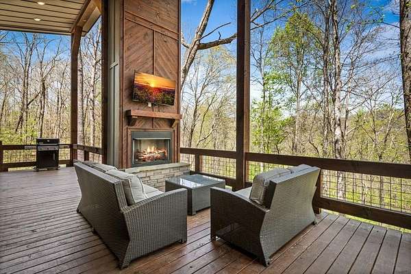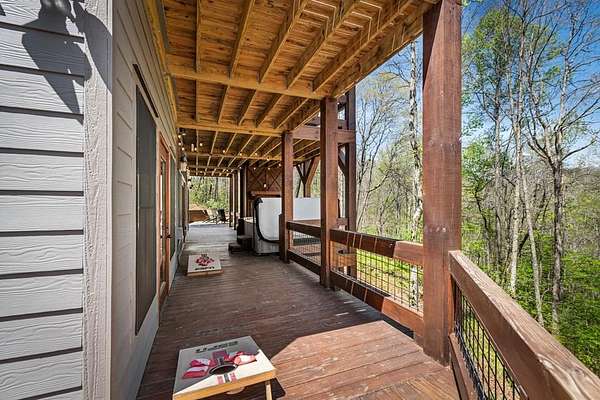 This rustic modern mountain cabin with seasonal mountain VIEW is the total package!Selling Turn Key FURNISHED—This 4 bedroom, 3 bath cabin has been lightly used and impeccably maintained, offering the rare opportunity to own a like-new home without the wait. Designed to impress the open-concept floor plan features wide plank wood floors, soaring cathedral ceiling and dramatic wall of windows that floods the great room with natural light while framing the mountain view. With 3 king-size bedrooms plus a fun bunk room, there's plenty of space to comfortably sleep 10, making it ideal for hosting family and friends or maximizing rental potential. Two luxurious ensuites on the main level offer convenience and privacy, while two full levels of living provide room to spread out and unwind. The finished terrace level is an entertainer's dream with a spacious family / recreation room complete with a wet bar—perfect for game nights and gathering after a day of adventure. Step outside and experience true mountain living with two levels of covered porches, each featuring its own outdoor fireplace, creating the perfect setting for year-round enjoyment. Relax in the hot tub, gather around the firepit, and soak in the peaceful surroundings. Located in the highly sought-after Cherry Log area, conveniently positioned between Ellijay and Blue Ridge, you're just minutes from favorites like Roo Mountain Vineyards, Bear Claw Vineyards, Cress Creek Farm, and endless outdoor adventures including hiking the Benton MacKaye Trail, mountain biking, and horseback riding. And unlike many mountain homes, this one offers EASY access with no steep or scary driveway and plenty of parking—a rare and valuable feature for both everyday living and guests. Whether you're looking for a private mountain escape, a full-time residence, or an income-producing investment, this stunning cabin delivers the lifestyle—and memories—you've been dreaming of.