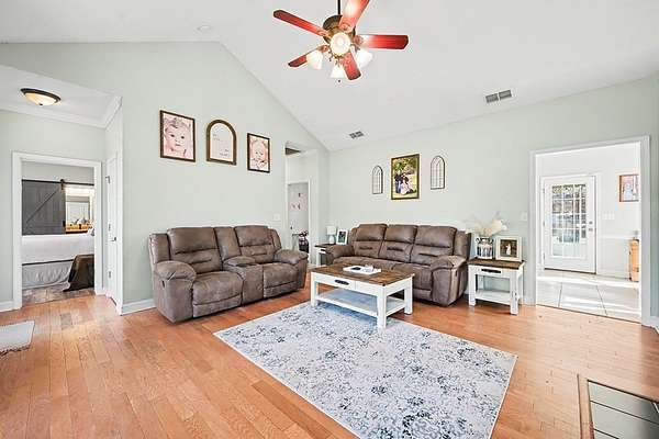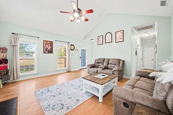 Lee County Home - Great Neighborhood Cul-de-Sac Lot with Wired Workshop on 2.89 Acres! Step into this inviting Melrose Gardens home and be welcomed by soaring ceilings, beautiful hardwood floors, a gas fireplace, and an abundance of natural light throughout. The spacious primary suite features a tray ceiling, bay windows, a walk-in closet, and a private bath with a separate toilet and shower area. A desirable split floor plan provides added privacy, with bedrooms two and three located at the rear of the home, one offering double closets. The kitchen boasts a breakfast bar and nook, a large pantry, and stainless steel appliances that will remain. Relax on the screened porch overlooking the fully fenced backyard or gather around the fire pit area--perfect for entertaining or unwinding. Additional features include a metal roof, long driveway, storage unit, RV hookups, and a private trail leading to a wired workshop, ideal for hobbies, projects, or additional workspace. Call today to schedule a tour of this one-of-a-kind home!