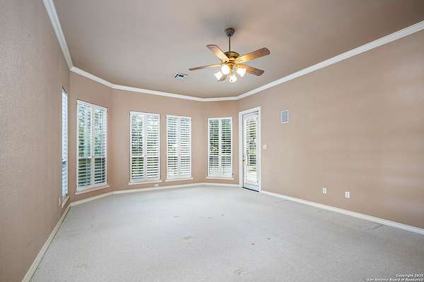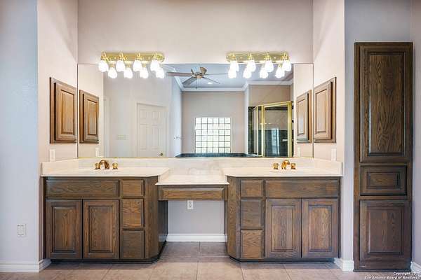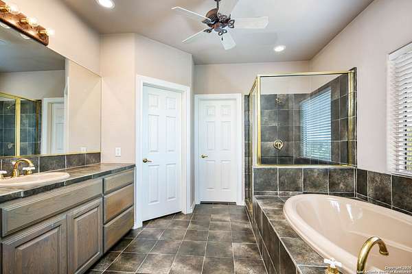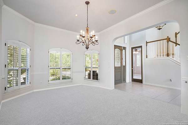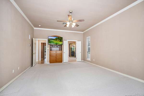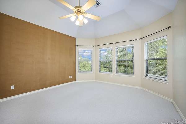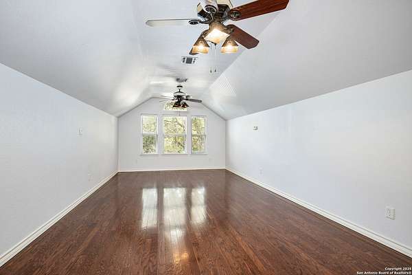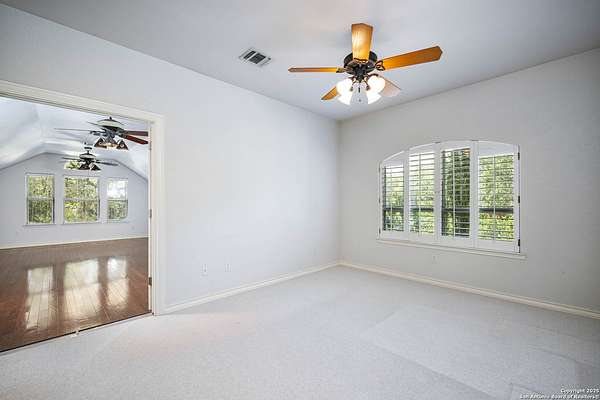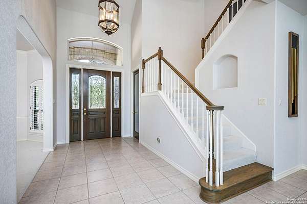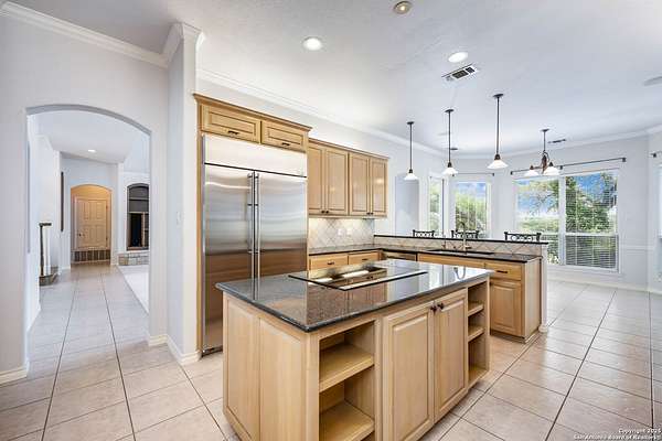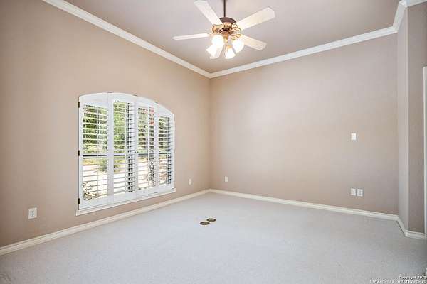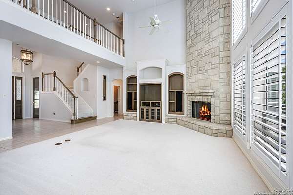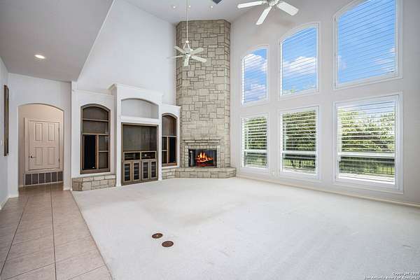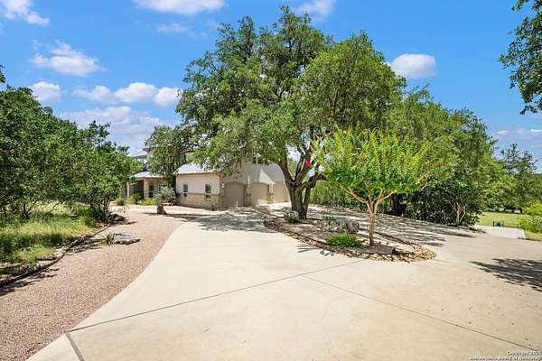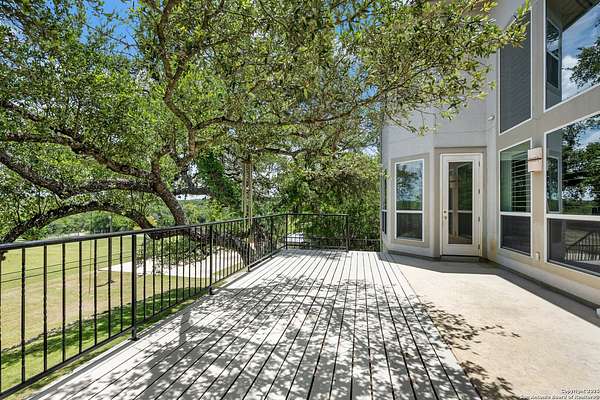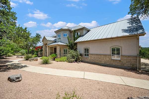 Nestled on 4.4 picturesque acres, this custom Hill Country style estate offers sweeping views and a lush pasture ideal for horses. A winding driveway leads to a circular drive and unveils a serene, park-like setting. Designed with the entertainer in mind, the expansive interior showcases stunning views and offers a seamless blend of formal and informal living spaces. The welcoming foyer features a soaring two story ceiling and opens to a spacious family room with immediate views of the peaceful backyard. Walls of windows and lofty ceilings fill the interior with natural light, while a dramatic two story stone fireplace with gas logs serves as the heart of the home. The gourmet kitchen is appointed with an oversized island, stainless steel appliances, double ovens, an abundance of custom cabinetry, extensive counter space, a breakfast bar and a walk-in pantry with floor to ceiling shelving. Adjacent to the kitchen, the sunny breakfast nook offers tranquil property views and convenient outdoor access. A private retreat, the split owner's wing features a spacious suite with room for a cozy sitting area overlooking the grounds. The bath includes dual vanities, a makeup station, tub and a walk-in shower. A dedicated study with ample storage completes the main level. Upstairs, discover a secondary owner's suite, two additional bedrooms, a relaxed sitting area, and a grand game room with double-door entry and hardwood flooring, perfect for family fun or entertaining guests. Outdoors, enjoy year round al fresco living on the multi-tiered decks, ideal for dining, lounging, or simply soaking in the serene surroundings. Expansive lawns and a basketball court provide ample space for recreation and play. Equestrian enthusiasts will appreciate the generous acreage and nearby nature trails. A large walk-in storage room is ideal for lawn equipment, gardening tools, or horse gear. Perfectly situated near the main guarded entrance and clubhouse, this property offers a opportunity to experience Hill Country living at its finest.