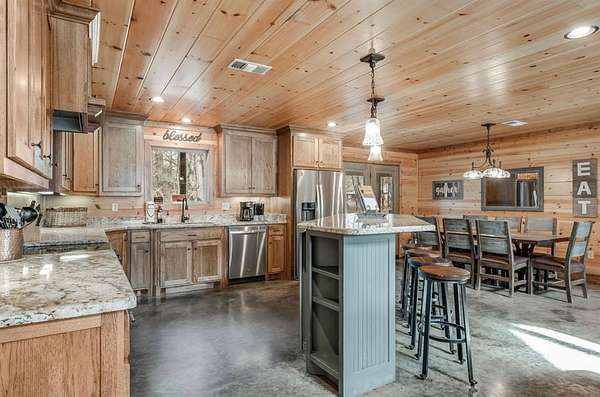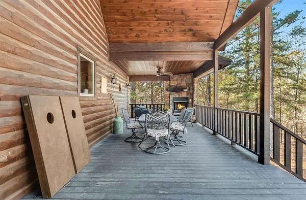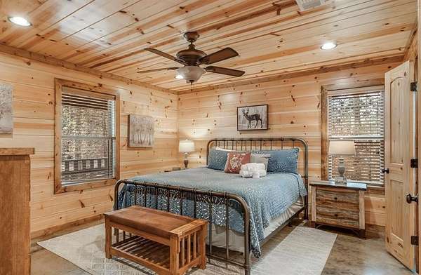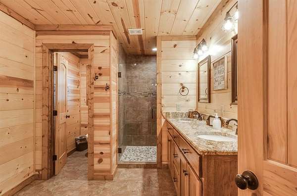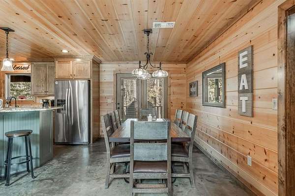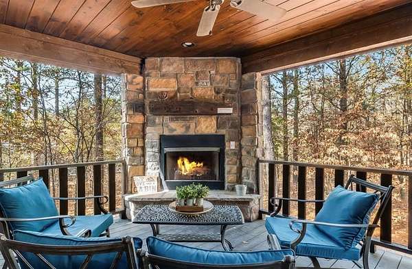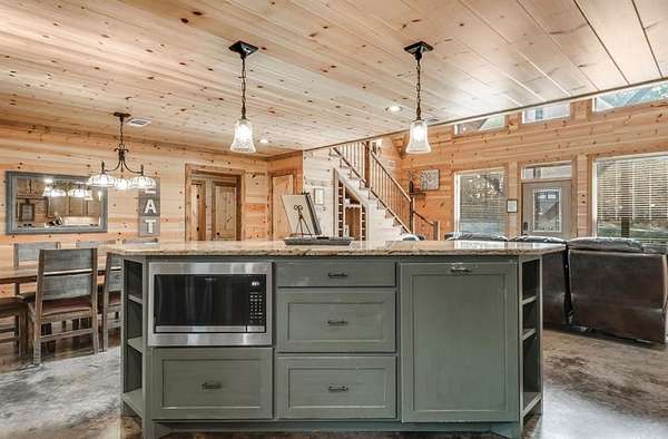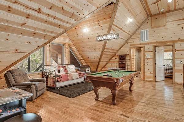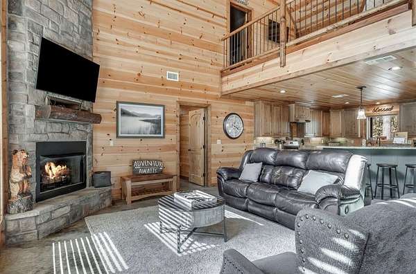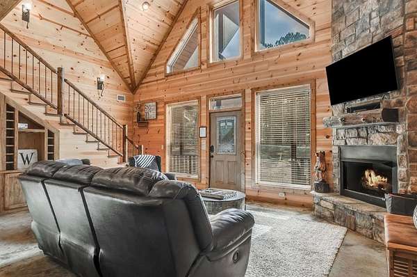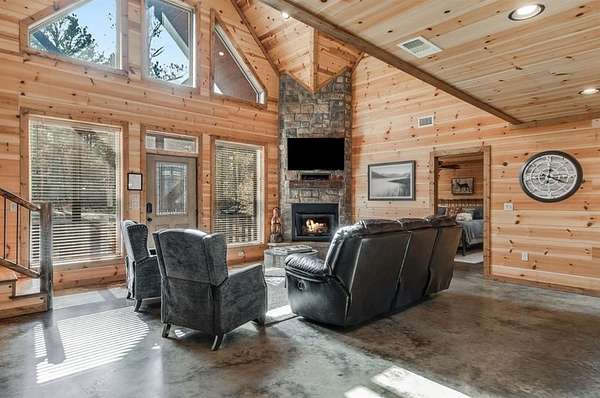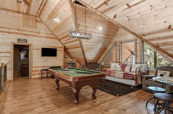WOODS END - 4 Bedroom | Game Room | Theater Room Don't miss your chance to view Woods End, a spacious 4-bedroom, 2,892 sq ft luxury cabin situated on a pristine, flat 1.53-acre wooded lot. The property offers ample space for future additions like a pickleball court or pool-perfect opportunities to maximize rental income. Guests will appreciate the large circular driveway, ideal for boat parking and easy access. Inside, the main living area features an inviting stone fireplace and an open-concept layout that blends the living, kitchen, and dining spaces-excellent for hosting and entertaining. The kitchen offers stainless steel appliances, granite countertops, and plenty of cabinetry for storage. The primary suite on the first floor includes an ensuite bathroom with a large soaking tub, tiled shower, double vanities, and a spacious walk-in closet. Two additional bedrooms are also on the main level, providing convenience and privacy for guests. Upstairs, a generous game room awaits-complete with a pool table and a second seating area. The fourth bedroom is located on this level as well. Directly across the game room, you'll find a theater room, which could easily be converted into a bunk room to further enhance rental potential. This cabin offers multiple configurations and opportunities for an owner looking to customize or expand. Step outside to the large back deck, showcasing another beautiful stone gas fireplace and a relaxing hot tub. Beyond the deck, enjoy a spacious backyard and a cozy firepit, perfect for creating memorable evenings under the pines. Woods End has all the essentials for a standout short-term rental or a private getaway-space, amenities, and room to grow