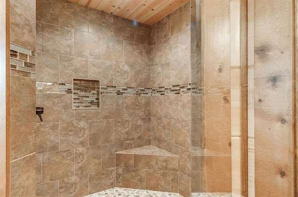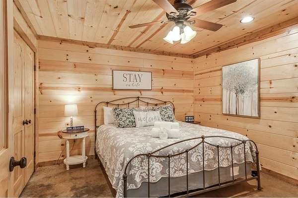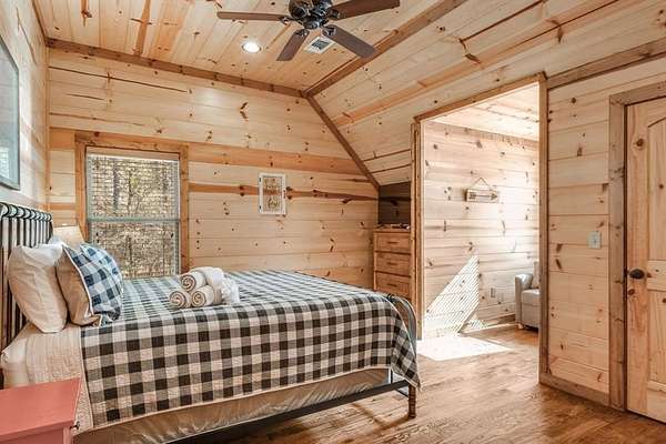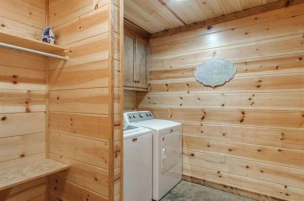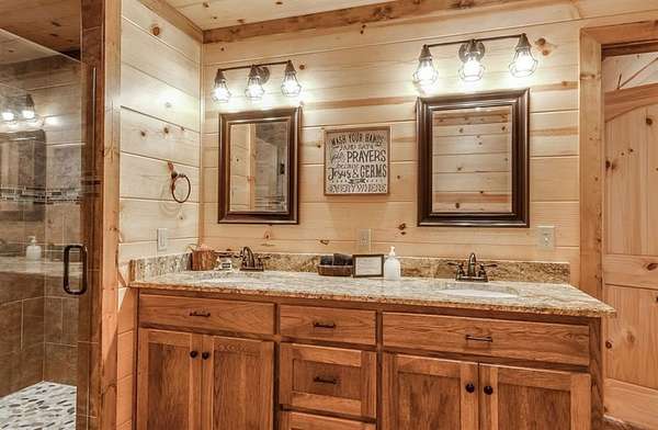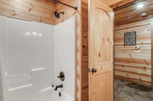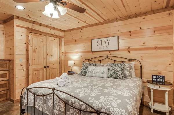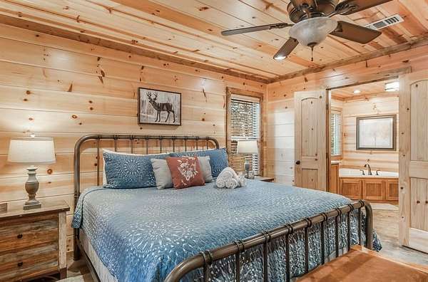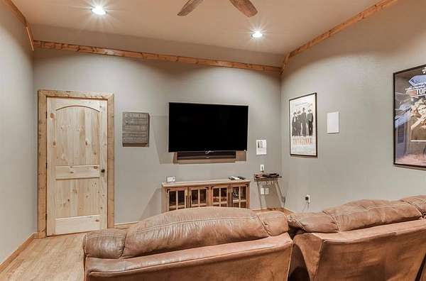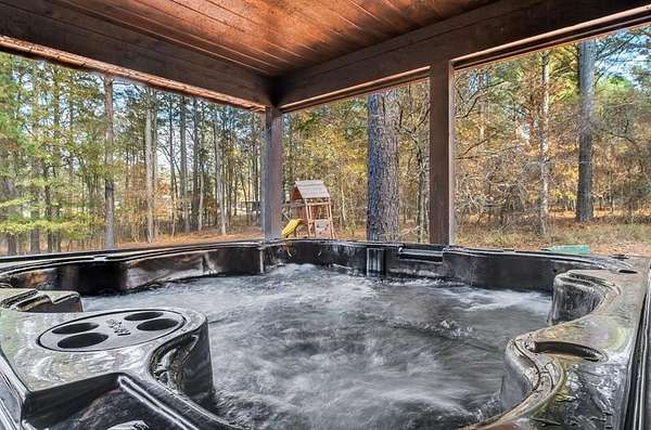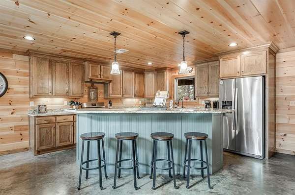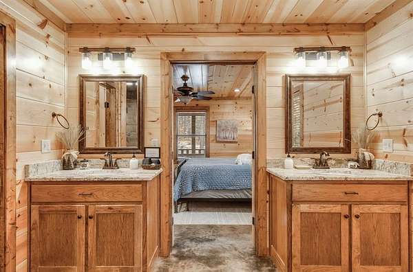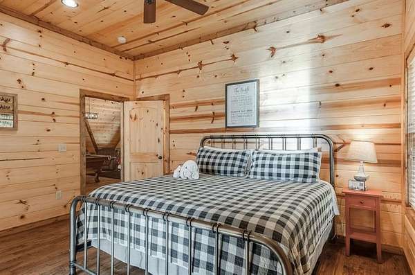WOODS END - 4 Bedroom | Game Room | Theater Room Don't miss your chance to view Woods End, a spacious 4-bedroom, 2,892 sq ft luxury cabin situated on a pristine, flat 1.53-acre wooded lot. The property offers ample space for future additions like a pickleball court or pool-perfect opportunities to maximize rental income. Guests will appreciate the large circular driveway, ideal for boat parking and easy access. Inside, the main living area features an inviting stone fireplace and an open-concept layout that blends the living, kitchen, and dining spaces-excellent for hosting and entertaining. The kitchen offers stainless steel appliances, granite countertops, and plenty of cabinetry for storage. The primary suite on the first floor includes an ensuite bathroom with a large soaking tub, tiled shower, double vanities, and a spacious walk-in closet. Two additional bedrooms are also on the main level, providing convenience and privacy for guests. Upstairs, a generous game room awaits-complete with a pool table and a second seating area. The fourth bedroom is located on this level as well. Directly across the game room, you'll find a theater room, which could easily be converted into a bunk room to further enhance rental potential. This cabin offers multiple configurations and opportunities for an owner looking to customize or expand. Step outside to the large back deck, showcasing another beautiful stone gas fireplace and a relaxing hot tub. Beyond the deck, enjoy a spacious backyard and a cozy firepit, perfect for creating memorable evenings under the pines. Woods End has all the essentials for a standout short-term rental or a private getaway-space, amenities, and room to grow
