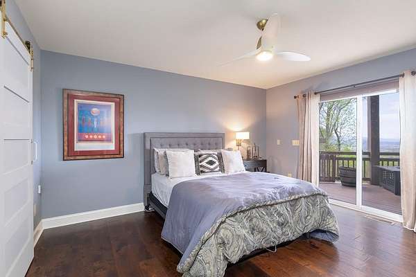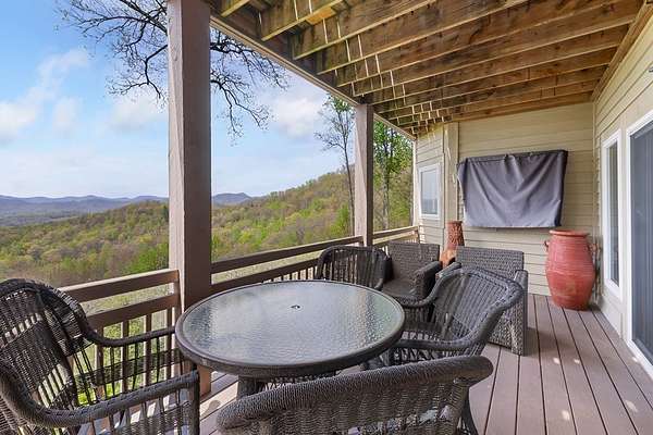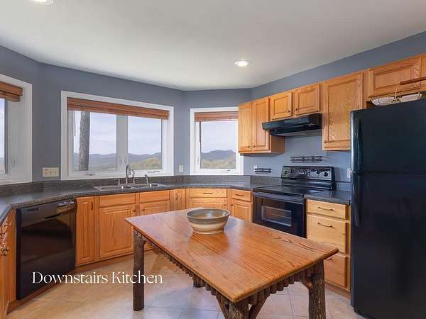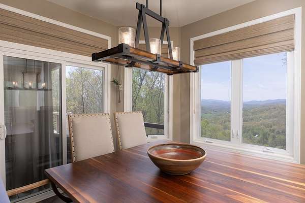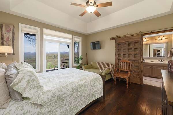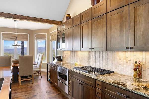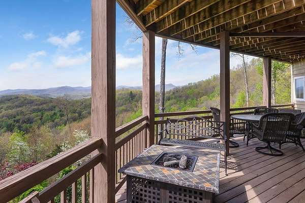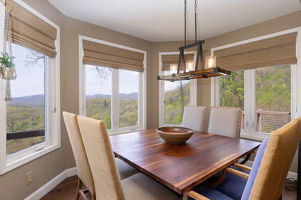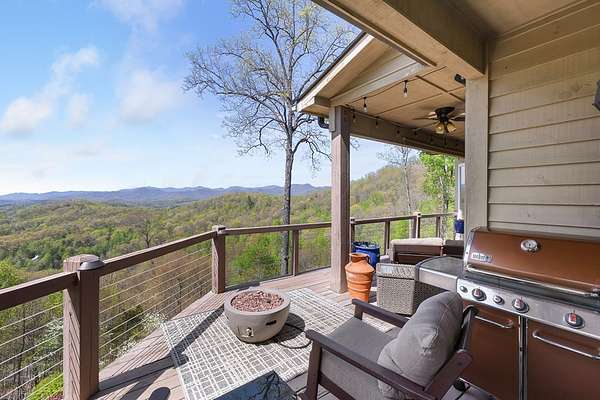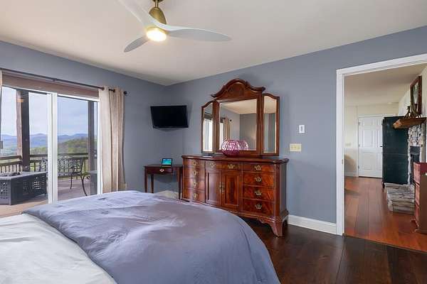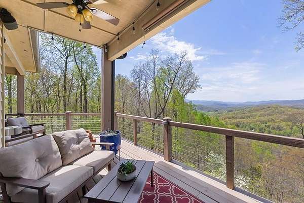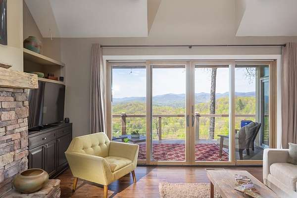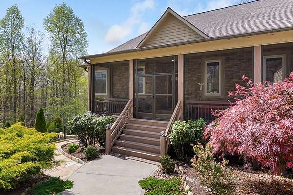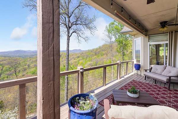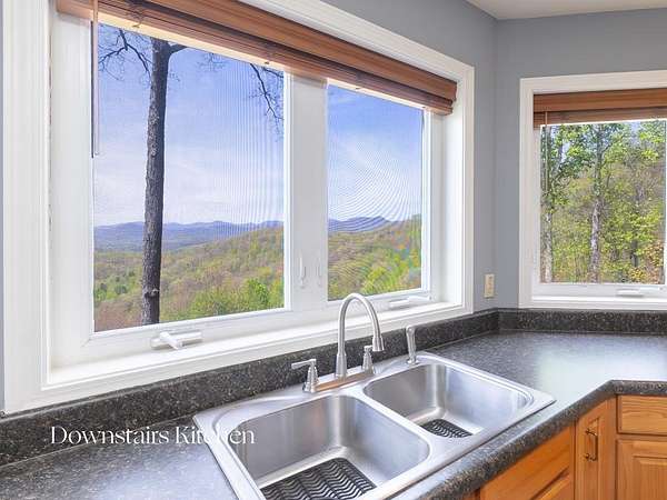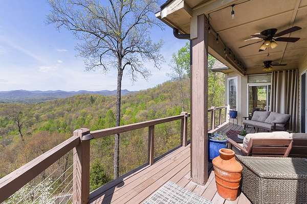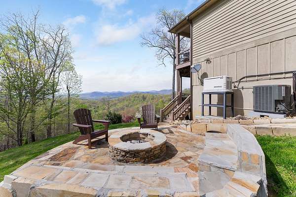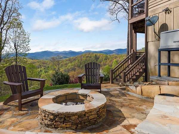This stunning 3-bed, 4-bath mountain retreat offers comfort, space, and jaw-dropping views!! Inside, vaulted ceilings, rich hardwood floors, and expansive windows create a warm, open atmosphere. Beautifully updated main level kitchen features stainless appliances, generous counter space, and connects seamlessly to a bright living area with a stone gas fireplace. Two main-level bedrooms include walk-in closets, en-suite baths, and direct deck access. The primary suite boasts a spa-like bath with a relaxing soaker tub and separate shower. Three bonus rooms throughout the home offer endless options for a home office, gym, hobby space, or guest overflow. The lower level includes a private suite with a full kitchen, living room with gas fireplace, full bath, and optional separate entrance--perfect for guests or multi-generational living. Outside, enjoy 2+ private acres, a fenced yard, a screened-in porch, and a stone fire pit--all framed by breathtaking long-range views. Enjoy easy access and seamless year-round living with a Generac generator that powers main-level systems, including the HVAC, ensuring comfort, convenience, and peace of mind no matter the season.