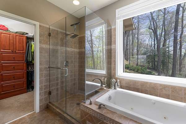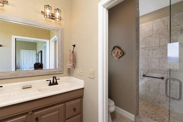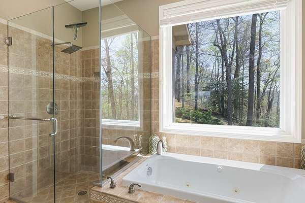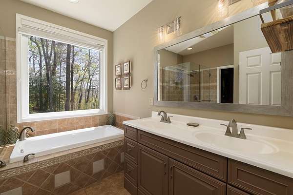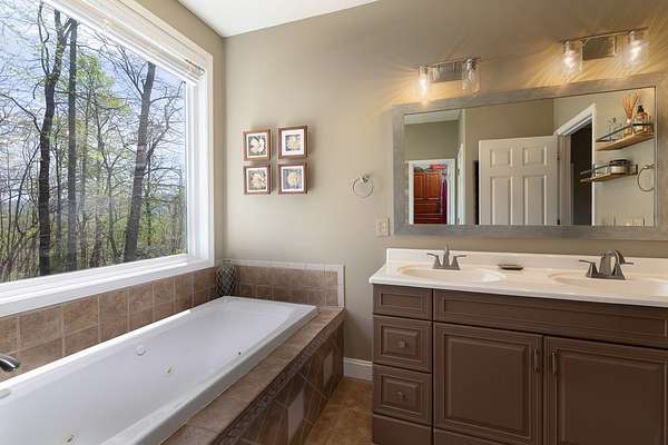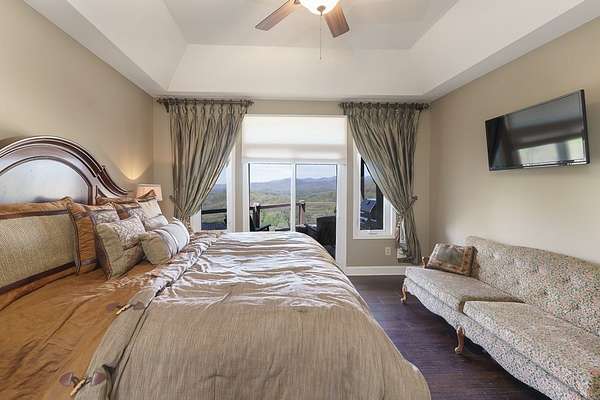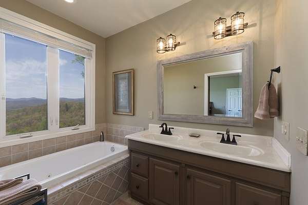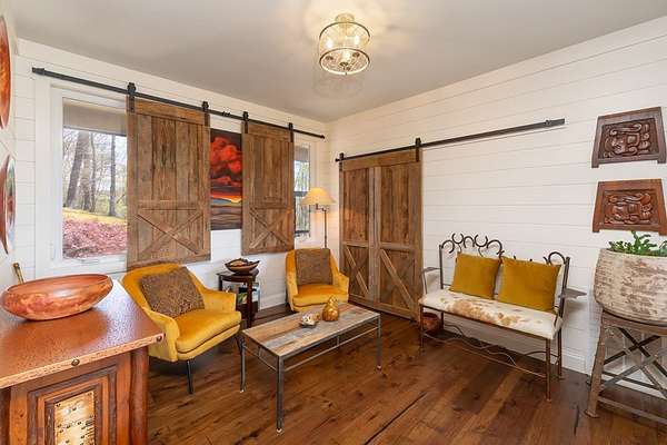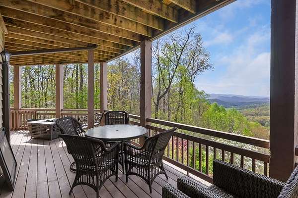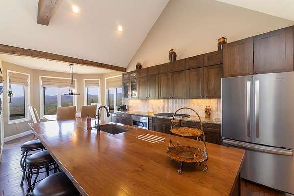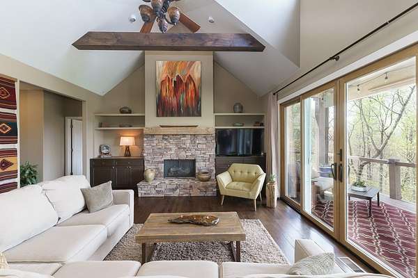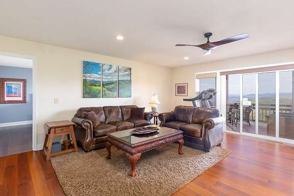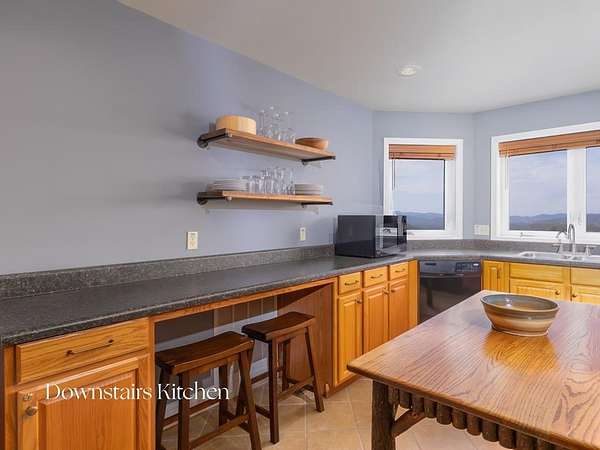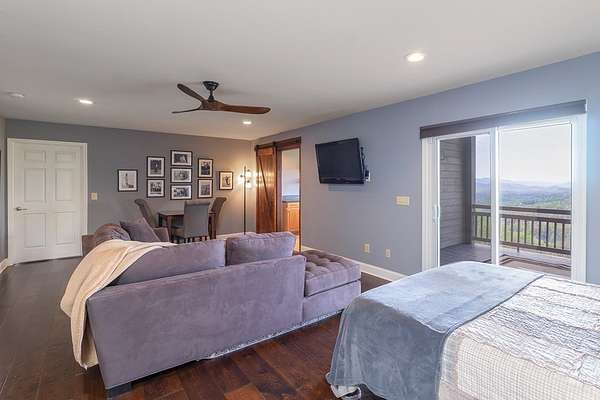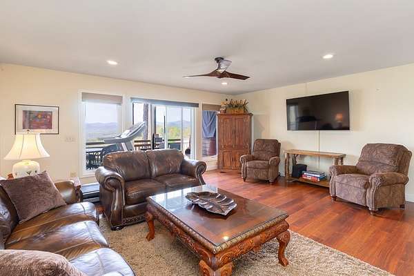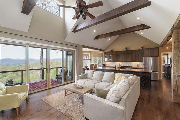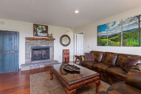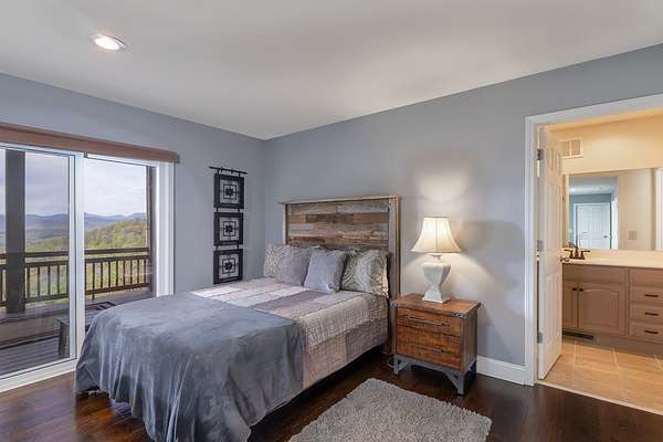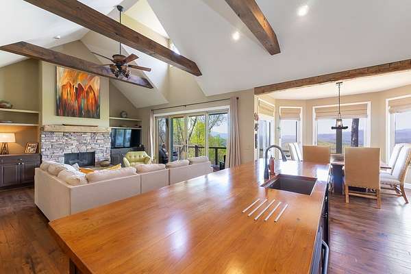 This stunning 3-bed, 4-bath mountain retreat offers comfort, space, and jaw-dropping views!! Inside, vaulted ceilings, rich hardwood floors, and expansive windows create a warm, open atmosphere. Beautifully updated main level kitchen features stainless appliances, generous counter space, and connects seamlessly to a bright living area with a stone gas fireplace. Two main-level bedrooms include walk-in closets, en-suite baths, and direct deck access. The primary suite boasts a spa-like bath with a relaxing soaker tub and separate shower. Three bonus rooms throughout the home offer endless options for a home office, gym, hobby space, or guest overflow. The lower level includes a private suite with a full kitchen, living room with gas fireplace, full bath, and optional separate entrance--perfect for guests or multi-generational living. Outside, enjoy 2+ private acres, a fenced yard, a screened-in porch, and a stone fire pit--all framed by breathtaking long-range views. Enjoy easy access and seamless year-round living with a Generac generator that powers main-level systems, including the HVAC, ensuring comfort, convenience, and peace of mind no matter the season.