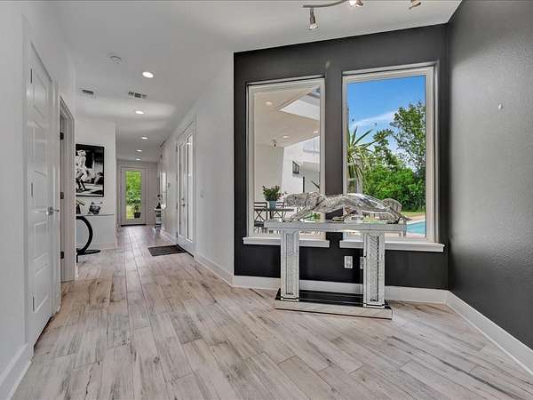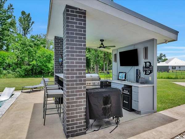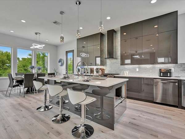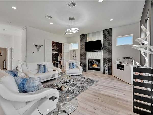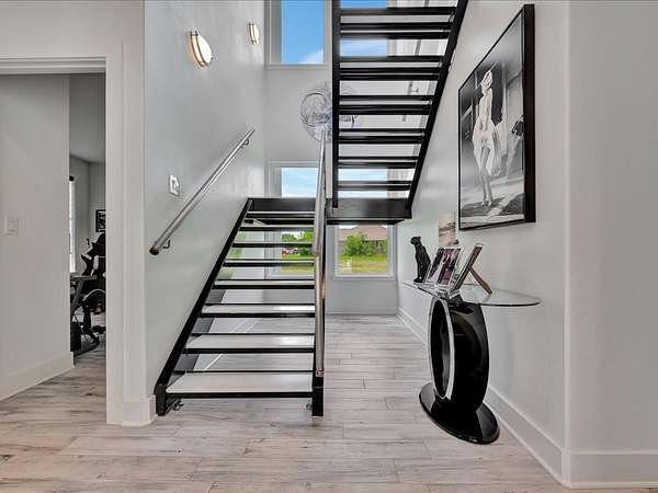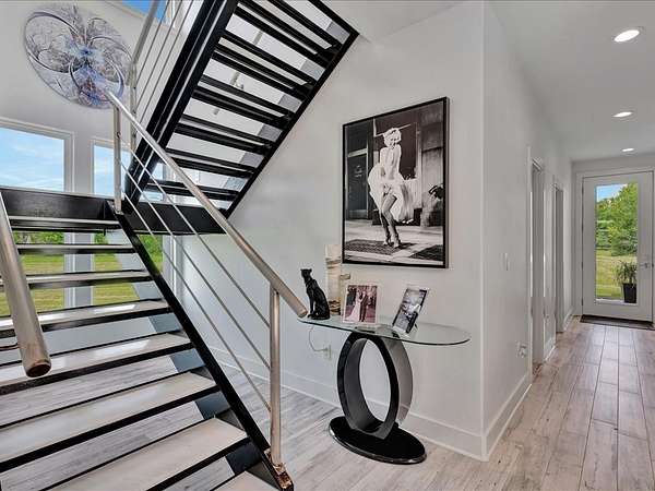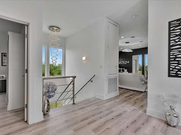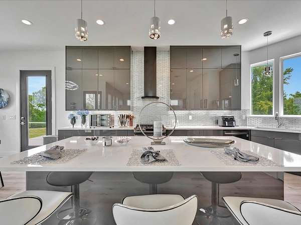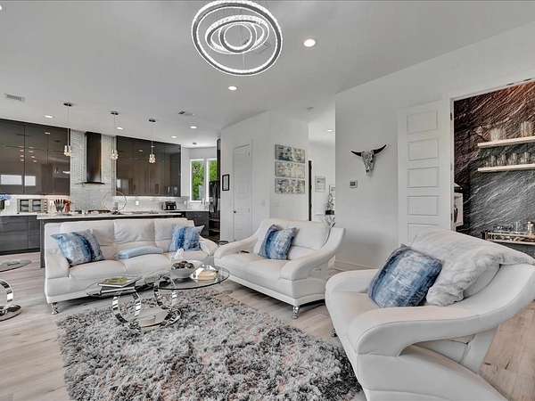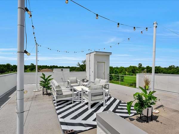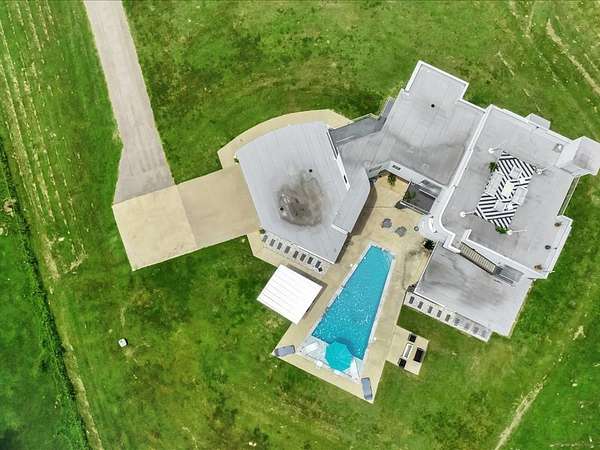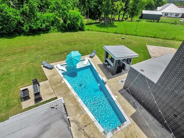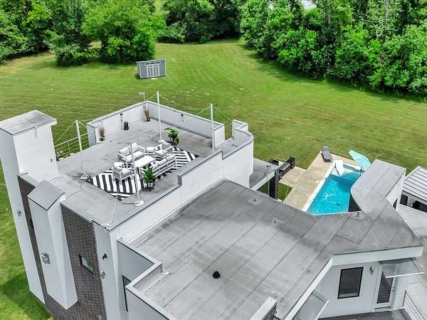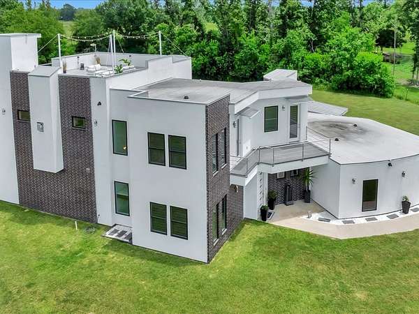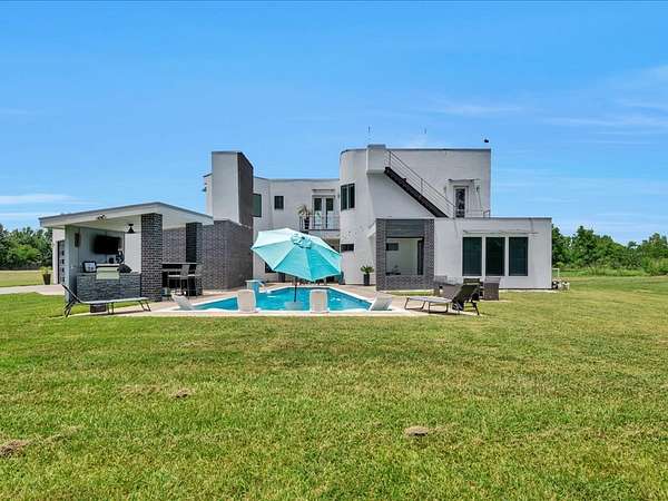 This one-owner custom modern home on 2.61 acres offers luxury living with designer finishes and high-end upgrades throughout. The main level features a serene primary suite with a spa-style shower wrapped in Ice Castle tile, plus two guest bedrooms for convenient first-floor living. The open-concept gourmet kitchen boasts European high-gloss cabinets, quartz countertops, Ice Castle backsplash, a large island with bar seating, and a walk-in pantry—perfect for entertaining. The living room is highlighted by a sleek fireplace accented with Italian tile. Upstairs includes a flexible bedroom or office and multiple balconies, while the third-floor rooftop terrace provides stunning panoramic views. Step outside to a resort-style pool, a fully equipped outdoor kitchen, and a poolside half bath. With marble stairs, beautiful tile floors, and abundant natural light, this home blends modern design, comfort, and seamless indoor-outdoor living.