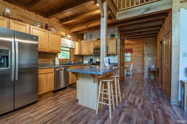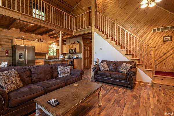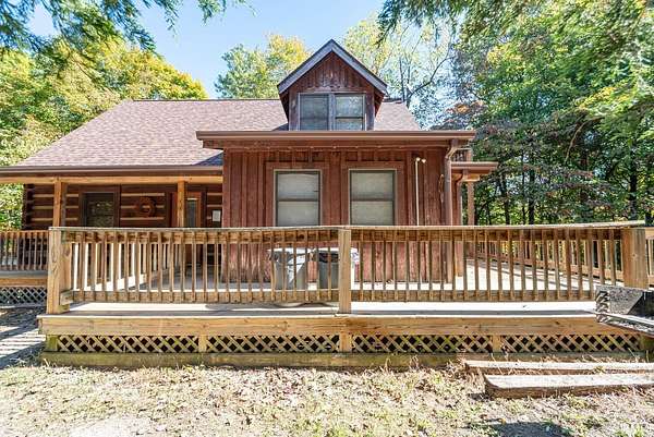Nestled between Yellowwood and Morgan/Monroe State Forests, this handsome four-bedroom, four-and-a-half-bathroom cabin offers the perfect blend of rustic charm and modern convenience. Sited on 11.71 acres of protected forest, this cabin has been custom designed and handcrafted from solid poplar logs (NOT a kit home). The all wood exterior, with wrap around decks, complements it's natural surroundings. Inside, an open living area features vaulted ceilings with a lofted overlook, a corner stone fireplace, and floor-to-ceiling windows that fill the space with natural light and breathtaking forest views. The well equipped kitchen has plenty of cabinet space, a central island and newer stainless steel appliances. A separate dining room is convenient to the kitchen or could easily be used as a home office. The main level primary suite has exposed log walls, a door leading outside to the wrap around deck and a private bath with jetted tub, stand up shower and a double bowl vanity. Upstairs the loft overlooks the living room below and is ideal for a comfortable seating area or flex space as needed. There is a generously sized bedroom with ensuite bath upstairs as well, with its own private outdoor balcony. In the lower level, there are 2 additional bedrooms with ensuite baths, and each has a door leading to the outside to enjoy the views. A rec room rounds out this level with space for a pool table or it could be used as a family room with a big screen tv! The outside has 11.71 acres with expansive decks wrapping around the cabin on 2 levels, offering multiple seating areas. Hike on a nearby trail, stargaze on the deck, or enjoy the coziness of the indoors, this cabin is an ideal retreat for nature lovers seeking a peaceful getaway. Conveniently located just east of Bloomington, this cabin is currently used as a popular tourist home rental. The hot tub and some interior furnishings may be negotiable. The adjacent cabin at 1275 N Sewell Road is also available for sale, MLS #