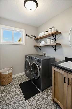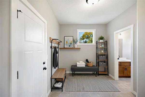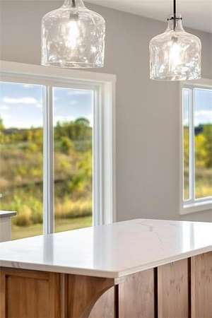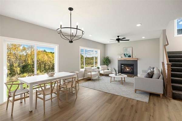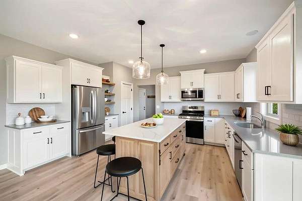 The open-concept main level features upgraded laminate flooring, custom cabinetry, quartz countertops, and stainless-steel appliances. The kitchen includes a center island, soft-close drawers, and a walk-in pantry. Adjacent dining area overlooks the acreage and connects to future deck or patio space. A main-level half bath and direct access to the insulated 4-stall garage (40x23) with concrete driveway complete the main floor.