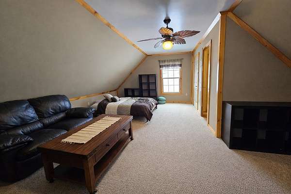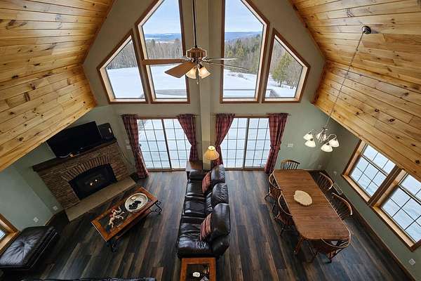 If you have been searching for the perfect home in Vermont, this 3 bedroom, 3 bath chalet sitting on 12.27 acres with breathtaking views of mountains, the distant Lake Memphremagog and tree covered hills is a must see. This home was built in 2014 by American Homes for the current owners and has been lovingly maintained and improved ever since. The open floor plan of kitchen, dining and living room, the cathedral ceiling and loft with sitting area and bedroom with half bath gives a feeling of spacious luxury as you walk through the home. Two large bedrooms, the primary with a ¾ bath, laundry/mud room and full bath on the first level are comfortable and offer plenty of places to rest and relax. The huge deck has loads of room for lots of guests, built in seating, patio furniture, and a gas grill, as well as privacy and amazing views. There is a whole house generator as well as central air conditioning and a 3 car garage with ample storage over. Newer standing seam metal roof, installed in 2020. The full concrete basement is a walk out with double doors to store equipment and toys and features a pellet stove for additional heating. Plenty of space to expand and add a family room, game room, etc. LP gas (Sellers had an underground propane tank installed a few years ago) heats the house and provides a warm and clean fireplace in the living room. Just a short drive to Jay Peak, Newport and Derby shopping, schools, churches and North Country Hospital. Not far from VAST and VASA trails. Newer appliances are included as well as some furnishings, see list. Don't wait too long to visit this lovely home!