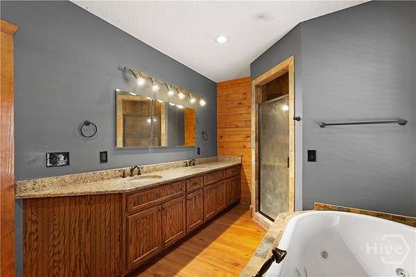 - Bathtub, Breakfast Bar, Ceiling Fan(s), Country Kitchen, Double Vanity, High Ceilings, Jetted Tub, Kitchen Island, Main Level Primary, Separate Shower, Vaulted Ceiling(s)