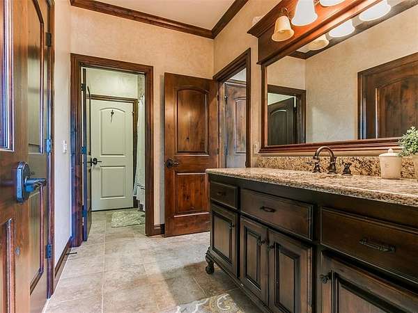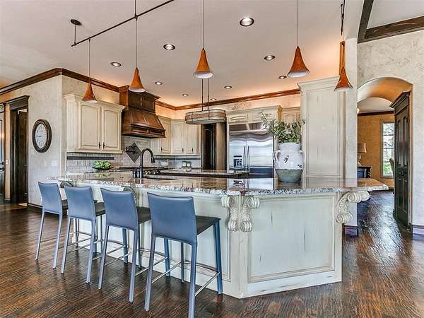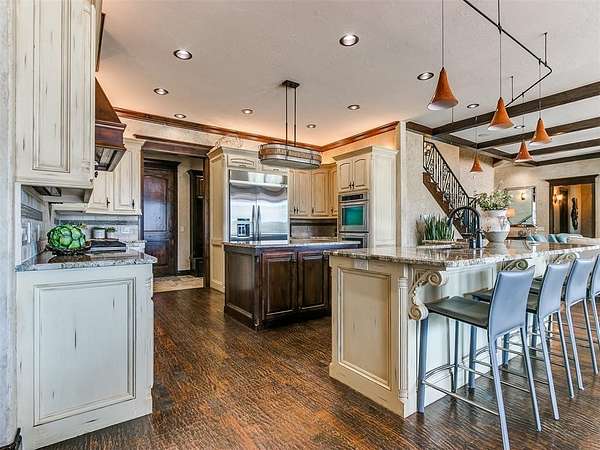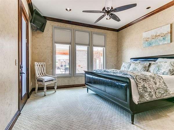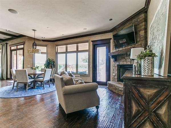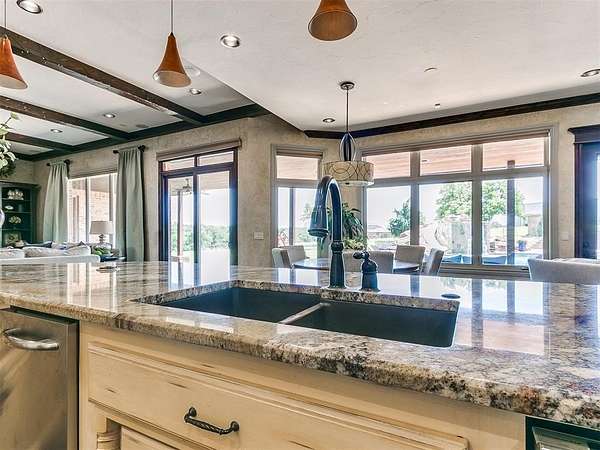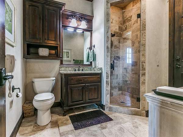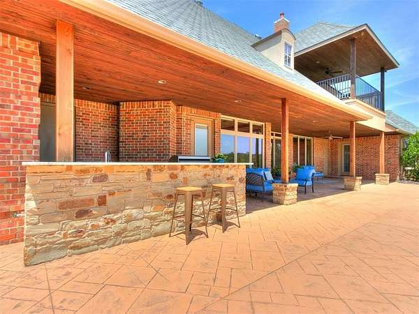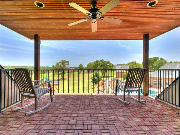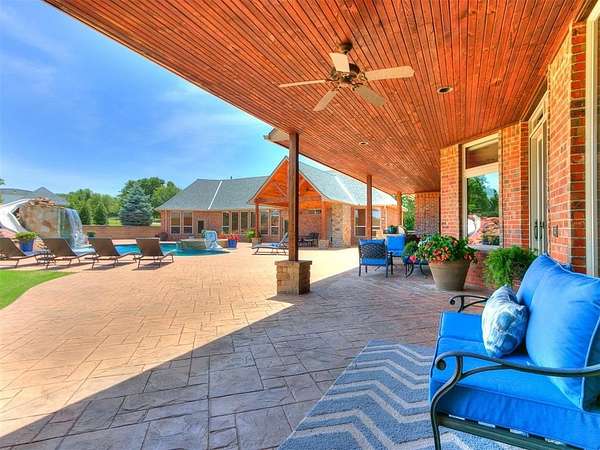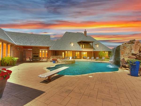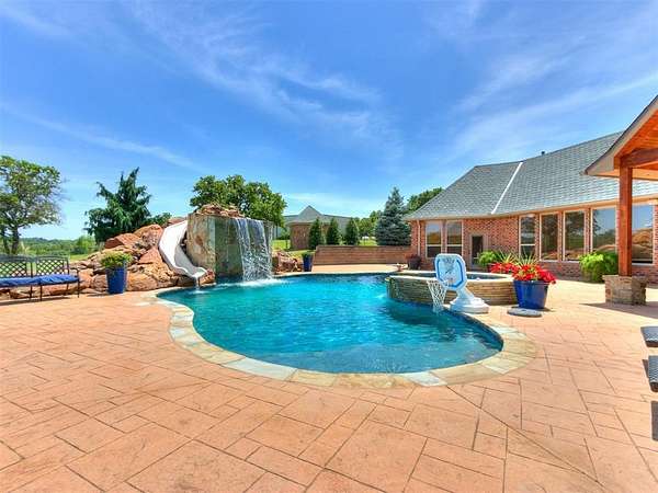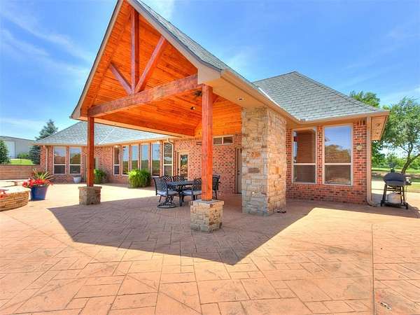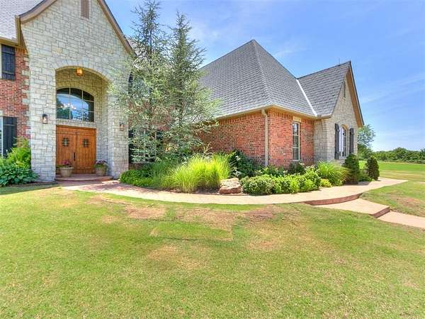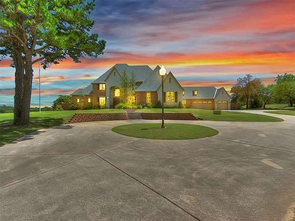 Lavish, private Choctaw estate! Gated entry, situated on 7.55 acres(mol). Short commute to downtown OKC & surrounding areas. Impressive grand entry! This amazing estate also includes guest quarters/pool house fully contained with 2 bedrooms, living room, kitchenette area, utility room and bathroom. The main house features 4 spacious bedrooms, 4 bathrooms, 3 living areas plus a study & oversized 6 car garage. The spacious main living room features raised beamed ceilings, general living room seating space plus additional conversational seating space, 2 fireplaces, hand-scraped hardwood flooring & more. The open floorplan includes a cook's dream kitchen featuring loads of cabinetry, beautiful granite counter tops, 2 islands, 6 burner stove top with a griddle, pot filler, double ovens, sub-zero refrigerator, huge pantry, breakfast bar, butlers prep area w/ice machine, etc. The master suite will easily accommodate king-sized furniture and features a fireplace, beautiful private bath area with loads of cabinetry and storage space, double vanities, whirlpool tub, walk-in shower, huge 3-tiered walk-in closet and more. Other features include a very nice private study with built-in book cases and desk space, a large formal dining room, a large inside utility room with great storage & counter space plus a sink. There is also an additional bedroom with a private bathroom. Other features include a true hidden basement area plus a saferoom. Upstairs features a wonderful large theatre room, plus a bonus room with a built-in refreshment area & balcony access. There are also 2 additional bedrooms plus 2 bathrooms. The exterior is a paradise of it's own. Features include two spacious back covered patio areas, an outdoor kitchen, a fireplace and an amazing inground pool with a rock waterfall, slide, gratto & special lighting. Another bonus is the oversized 6 car garage delivering over 1,800 square feet of attached garage space.