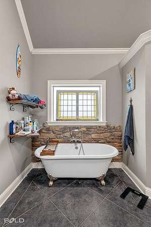 The private primary suite is tucked away on its own side of the home and includes a generous bedroom, en suite bath with separate tub and shower, double vanities, and a walk-in closet. Three additional bedrooms are positioned on the opposite side of the home and share a well-appointed full bath, offering privacy and flexibility for family, guests, or a home office.