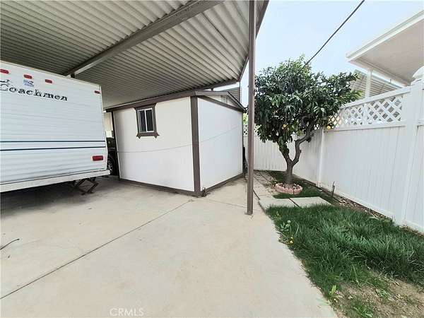 One of the most affordable lots available in the gated 55+ community of Mountain Shadows Resort, you OWN the land beneath your home with NO space rent. This is a B lot with a with shed and large carport covering. The exterior showcases partial vinyl fencing and easy-to-maintain hardscape with a lovely citrus tree. Spend more time enjoying the sunsets and the views of Big Bear mountain range from the convenience of this community. This fantastic 55+ community features state of the art amenities including pool, spa, club house, many events for the active lifestyle: Community dinners, dances, and Saturday Breakfast. So much to do in this gated and secure community. HOA $293/month and covers water, sewer, trash, internet and basic cable. This scenic oasis awaits you. (Trailer does not convey with land)
