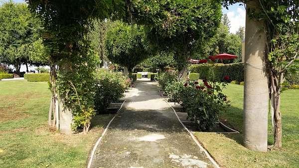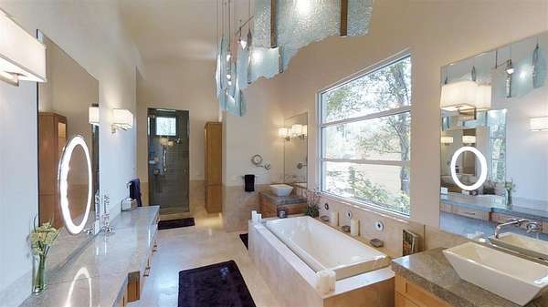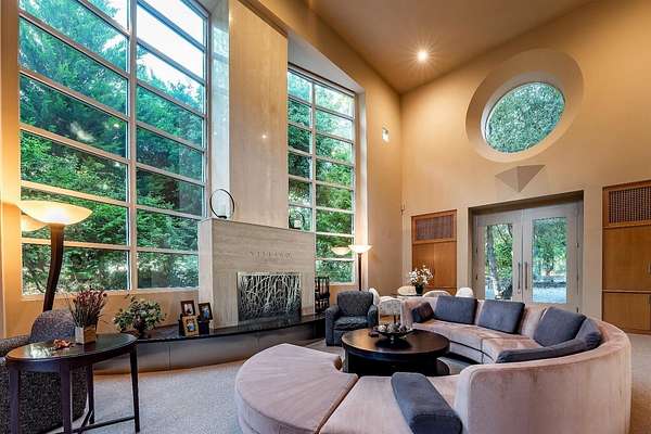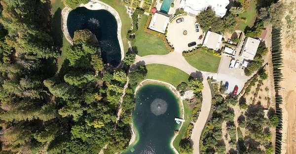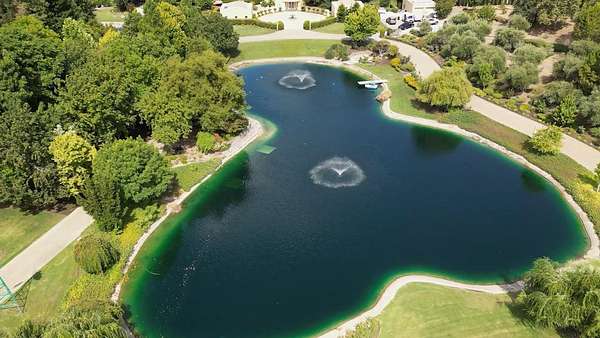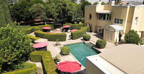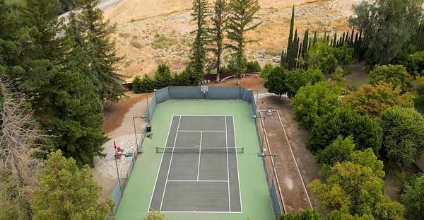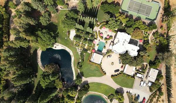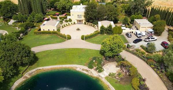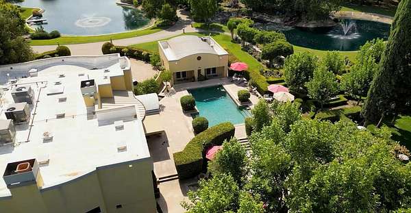 One-of-a-kind Palladian estate known as The Villago, set on nearly 10 acres with breathtaking views, unforgettable sunrises and sunsets, and over 200 owned solar panels (most of the panels are newer) for remarkable efficiency. Built in 1988, this extraordinary 6,424+/- sq. ft. multi-level home offers 5 bedrooms and 5 bathrooms surrounded by thoughtfully updated HVAC, mini splits, electrical, irrigation, updated French drains, and ponds. The grounds feature leveled brick paths, scenic trails, mature trees, two ponds with fountains, and a private tennis court with LED lighting. EV charging capability in the garages plus a 50-amp RV hookup. Updated circuit board and pump equipment the septic and well also serves a great cost-effective home. The grand entry draws you into a stunning living space framed by floor-to-ceiling views of nature and multiple French doors opening to the exterior grounds. An elegant oval dining room with private doors creates the perfect setting for intimate dinners or meetings. The kitchen showcases panoramic views of the pool and landscape, a cozy breakfast nook, and ideal flow for hosting. Multiple flexible spaces throughout the home offer options for offices, gatherings, or quiet retreats, plus an impressive laundry room. Just upstairs, the oversized primary suite is a sanctuary with exterior access, heated floors, floor-to-ceiling windows, a jaw-dropping closet, spa-like bathroom with soaking tub, walk-in shower, extended vanity, and abundant storage. Additional upper levels include a library/office that can convert to a bedroom, loft-style spaces overlooking the grand living room, private bedroom suites with their own bathrooms, and a unique observatory-style sitting area to take in the views. Entertain in style with sitting area including outdoor speakers throughout the property, a temperature-controlled wine cellar and tasting room adorned with custom murals. Outdoors, enjoy the pool with outdoor shower and a detached guest quarters offering TWO private bedroom suites beside the pool. Two detached 4-car garage buildings with climate-control mini splits provide incredible versatility for hobbies, business, media, or storage. Fire department quick hookup available by the pond. A rare estate where architecture, nature, privacy, and functionality come together in a truly unforgettable setting. Bedroom count and sq ft may reflect differently on tax records. Buyer to verify all information to their satisfaction.