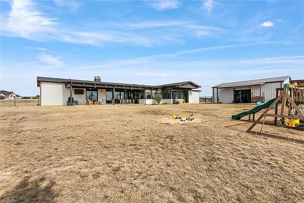 This custom-built mid-century modern home sits on a private 2-acre setting and blends timeless design with thoughtful luxury. Expansive windows throughout flood the home with natural light and frame stunning views of the open plateau, with no neighbors behind for added privacy. The heart of the home features an impressive chef's gas range, ideal for both everyday living and entertaining. A striking double-sided gas fireplace connects living spaces and adds warmth and architectural interest.