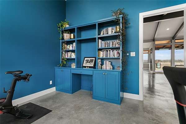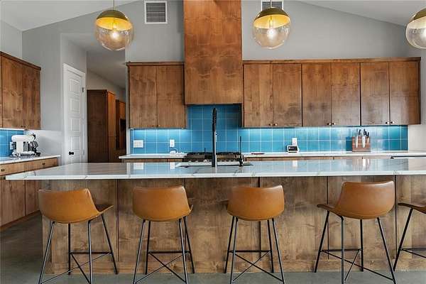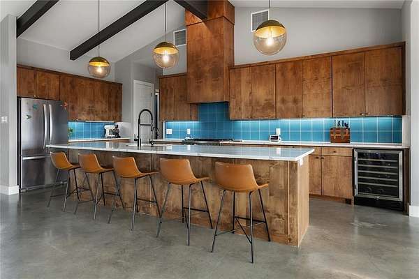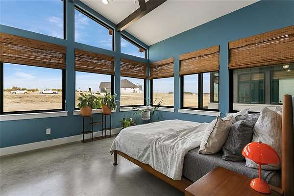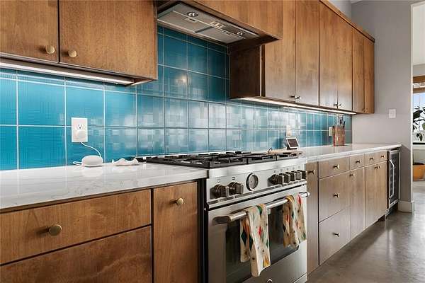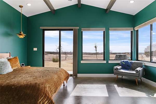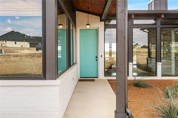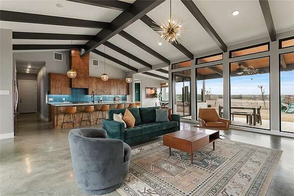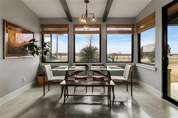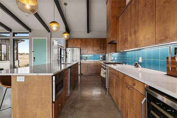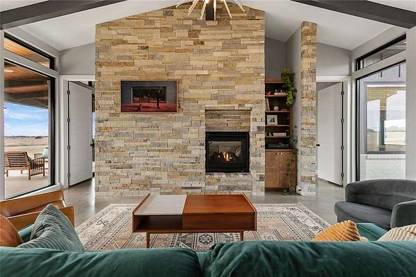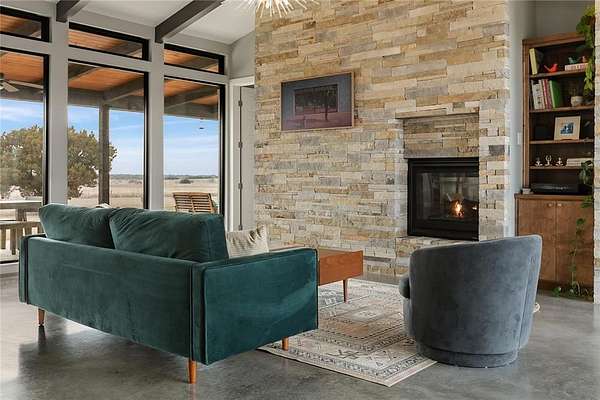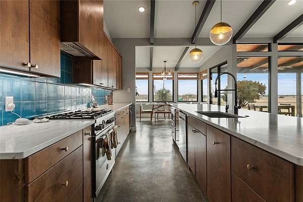 This custom-built mid-century modern home sits on a private 2-acre setting and blends timeless design with thoughtful luxury. Expansive windows throughout flood the home with natural light and frame stunning views of the open plateau, with no neighbors behind for added privacy. The heart of the home features an impressive chef’s gas range, ideal for both everyday living and entertaining. A striking double-sided gas fireplace connects living spaces and adds warmth and architectural interest.