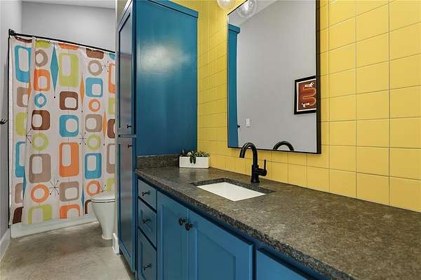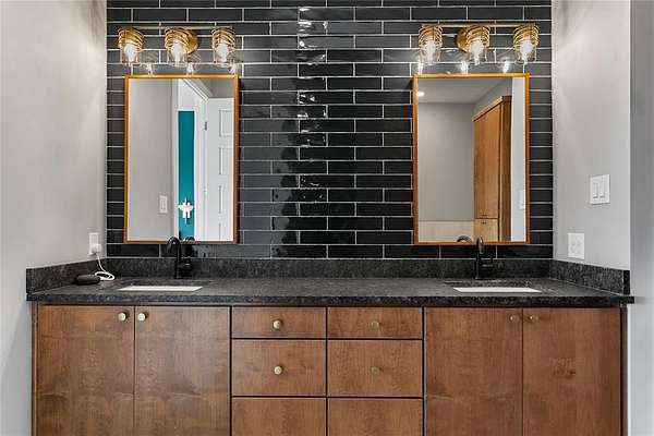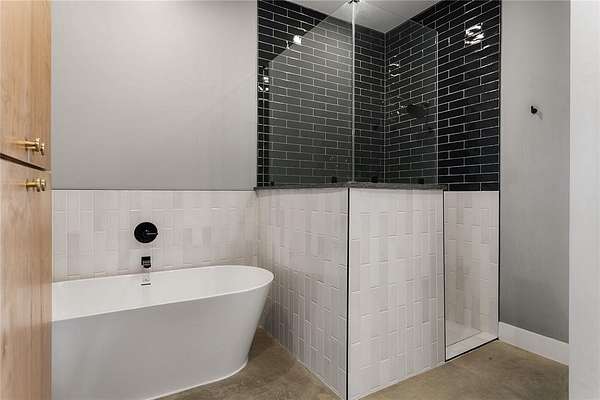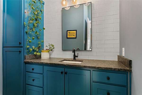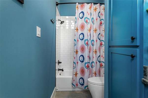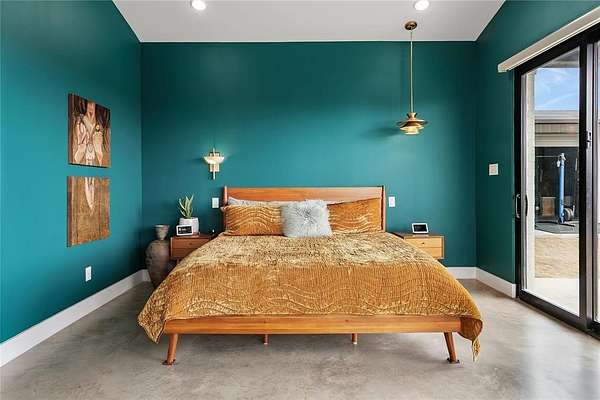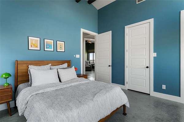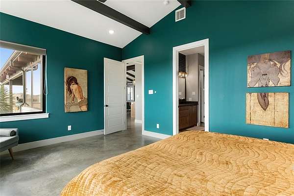 The home offers four spacious bedrooms and three full bathrooms, including a luxurious primary suite with a large soaking tub, separate shower, and beautifully executed custom tile work. Exposed beams span the ceilings, enhancing the mid-century character, while custom lighting and top-of-the-line closet systems add both style and function.