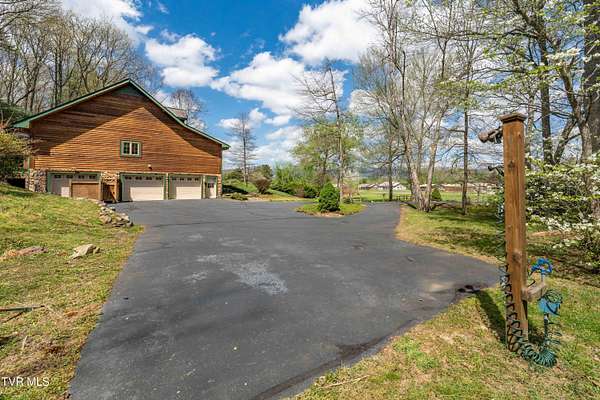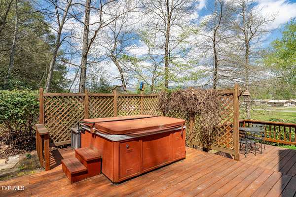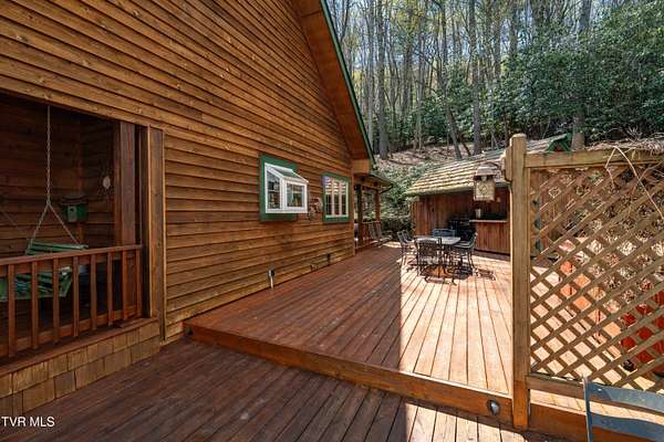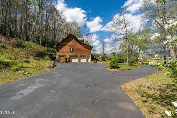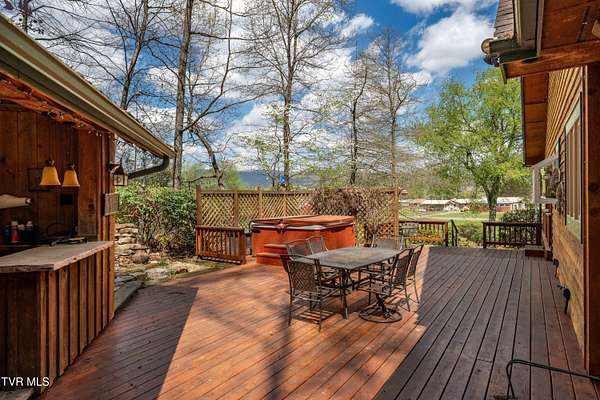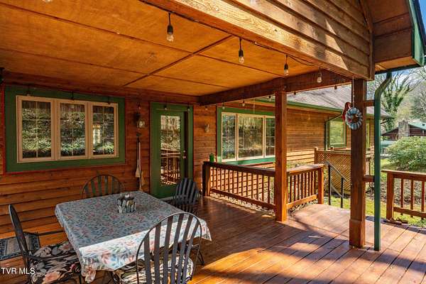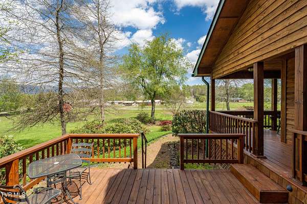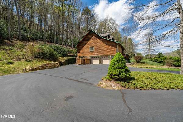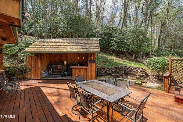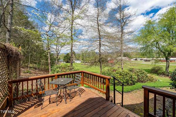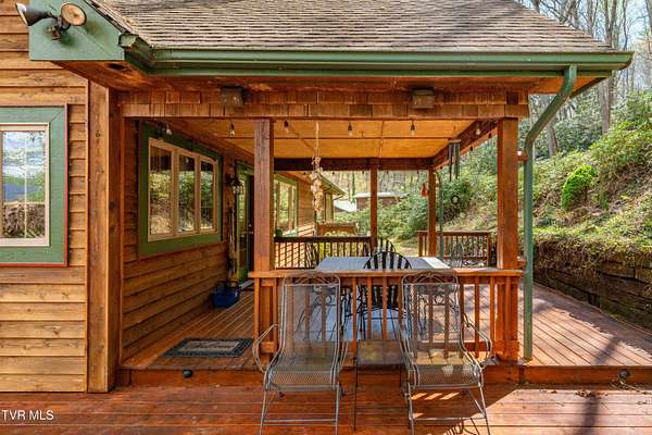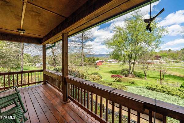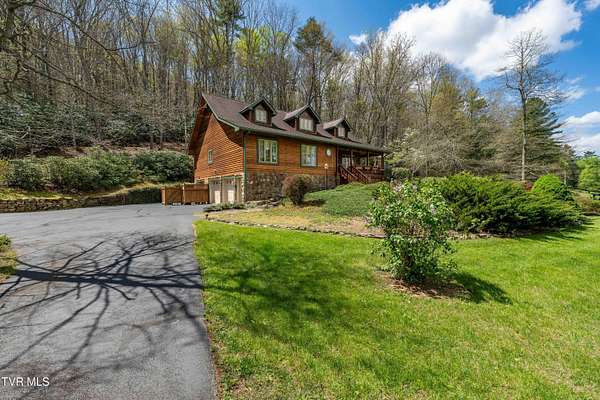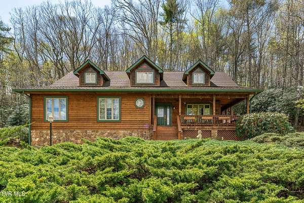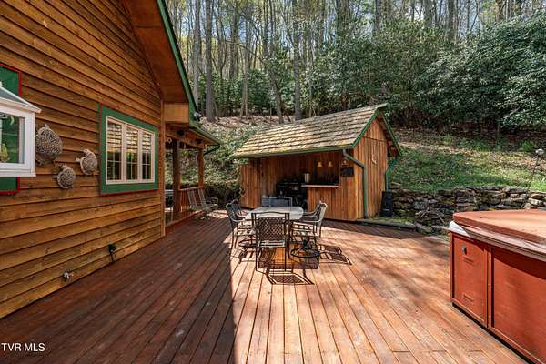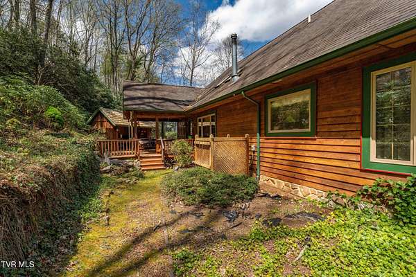 Tucked just outside the quaint town of Mountain City, this custom-built home offers a rare blend of natural beauty and thoughtful design, set on 3.37+/- acres in the stunning mountains of Northeast Tennessee. A picturesque creek winds through the property, complemented by charming stone paths, a beautifully level lawn area, and a variety of trees and landscape elements. The setting feels like a private retreat, with a wooded mountain backdrop and landscaping crafted by nature itself. Enjoy easy access via a paved driveway leading to a circular drive with an outside washing station, a spacious three-bay garage, and an impressive 26 x 61 red barn--ideal for hobbies, storage, or future possibilities. Outdoor living shines here, with a covered outdoor kitchen, hot tub, wraparound deck, and an additional back deck designed for entertaining. A welcoming covered front porch, classic dormers, and timeless architectural details create inviting curb appeal. Inside, the home features vaulted ceilings, skylights, and exposed European-style beams in the living room, anchored by a beautiful stone hearth and wood stove. The eat-in kitchen includes an island and garden window, while a formal dining room and foyer add to the home's thoughtful layout. Tile and wood floors run throughout. The home features three bedrooms and two baths, including a spacious primary suite with a jetted tub and walk-in closet with built-in organizers. Additional highlights include casement windows. The property also offers plenty of road frontage along with a perfect area for a second residence, adding flexibility and future potential. The basement is already plumbed for a bathroom and offers substantial square footage ready to be finished to your style and needs. Fashioned with love and offered for the first time on the market, this home is ideally located near Watauga Lake, the High Country, and all Tri-Cities amenities. Come and enjoy all four seasons. Tennessee is calling so let country roads take you there. Buyer and buyer's agent to verify all information.