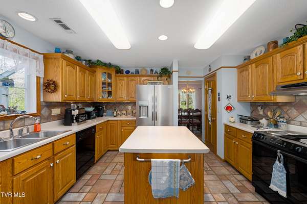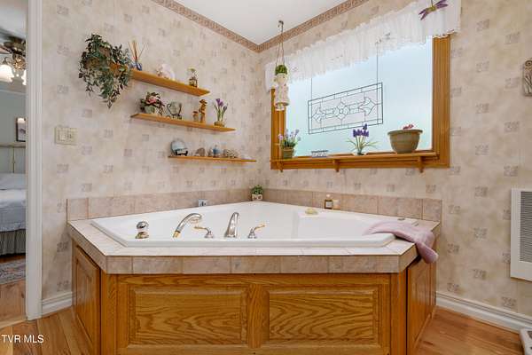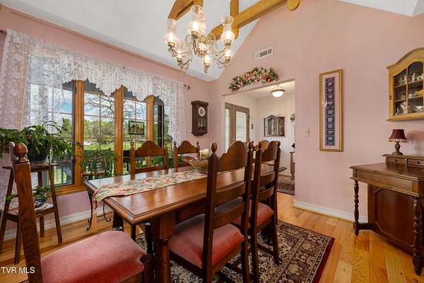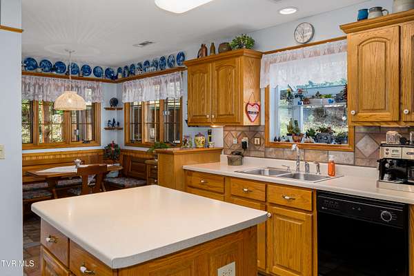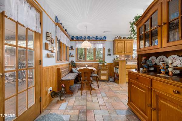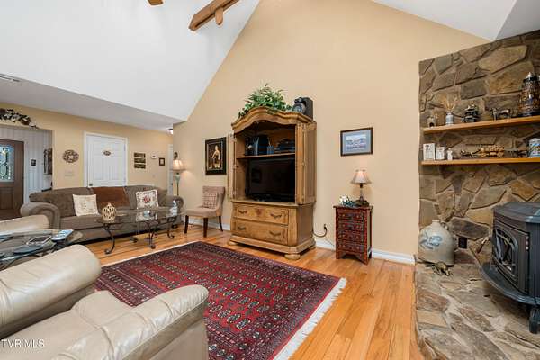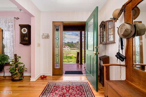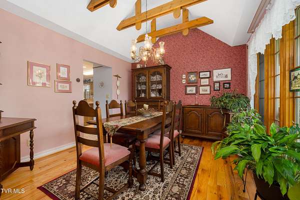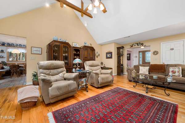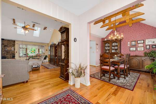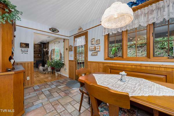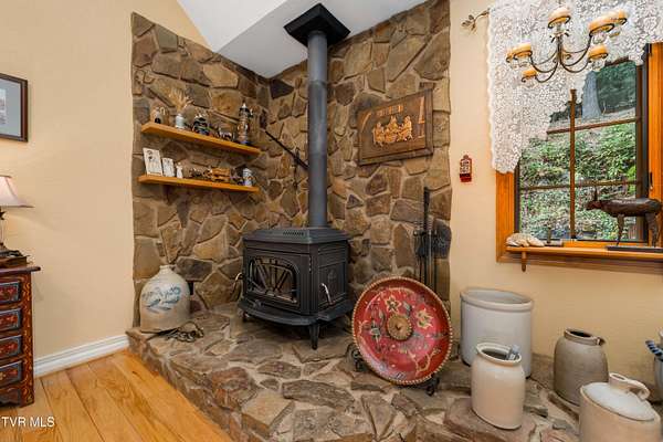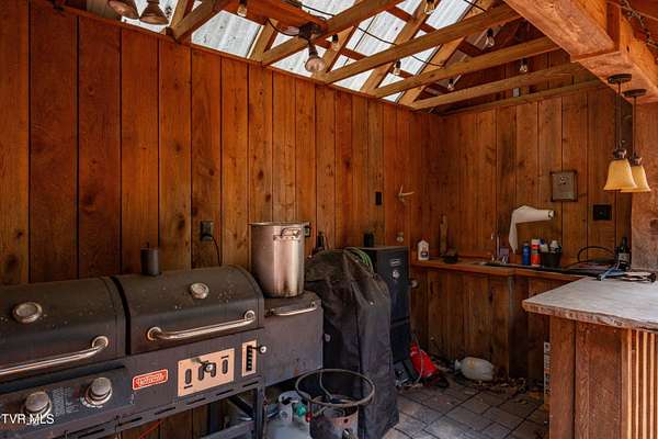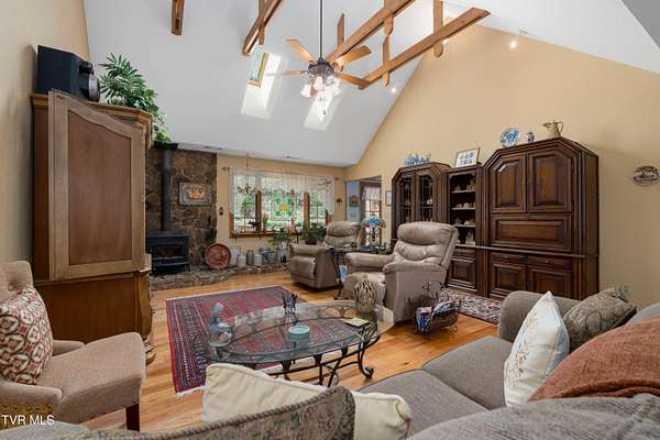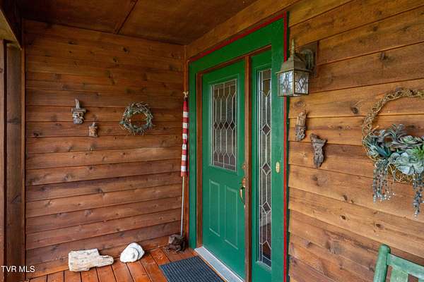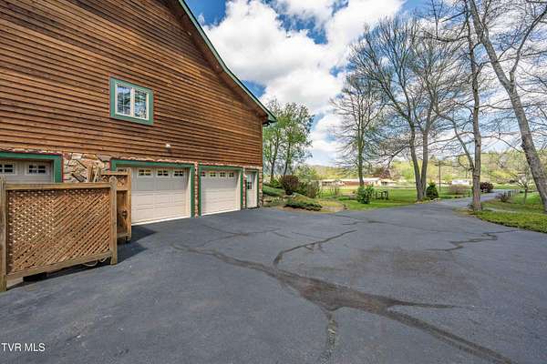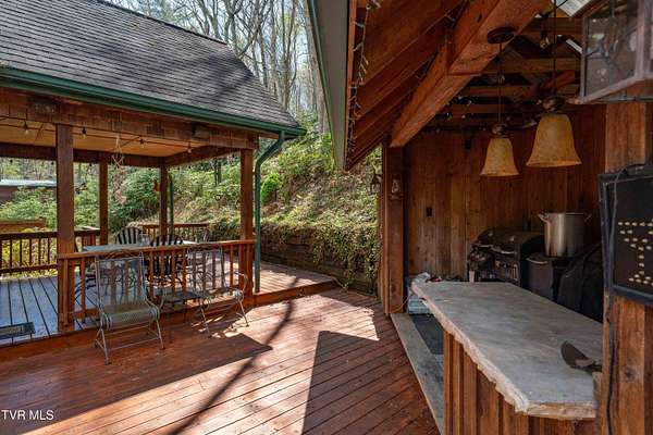 Tucked just outside the quaint town of Mountain City, this custom-built home offers a rare blend of natural beauty and thoughtful design, set on 3.37+/- acres in the stunning mountains of Northeast Tennessee. A picturesque creek winds through the property, complemented by charming stone paths, a beautifully level lawn area, and a variety of trees and landscape elements. The setting feels like a private retreat, with a wooded mountain backdrop and landscaping crafted by nature itself. Enjoy easy access via a paved driveway leading to a circular drive with an outside washing station, a spacious three-bay garage, and an impressive 26 x 61 red barn--ideal for hobbies, storage, or future possibilities. Outdoor living shines here, with a covered outdoor kitchen, hot tub, wraparound deck, and an additional back deck designed for entertaining. A welcoming covered front porch, classic dormers, and timeless architectural details create inviting curb appeal. Inside, the home features vaulted ceilings, skylights, and exposed European-style beams in the living room, anchored by a beautiful stone hearth and wood stove. The eat-in kitchen includes an island and garden window, while a formal dining room and foyer add to the home's thoughtful layout. Tile and wood floors run throughout. The home features three bedrooms and two baths, including a spacious primary suite with a jetted tub and walk-in closet with built-in organizers. Additional highlights include casement windows. The property also offers plenty of road frontage along with a perfect area for a second residence, adding flexibility and future potential. The basement is already plumbed for a bathroom and offers substantial square footage ready to be finished to your style and needs. Fashioned with love and offered for the first time on the market, this home is ideally located near Watauga Lake, the High Country, and all Tri-Cities amenities. Come and enjoy all four seasons. Tennessee is calling so let country roads take you there. Buyer and buyer's agent to verify all information.