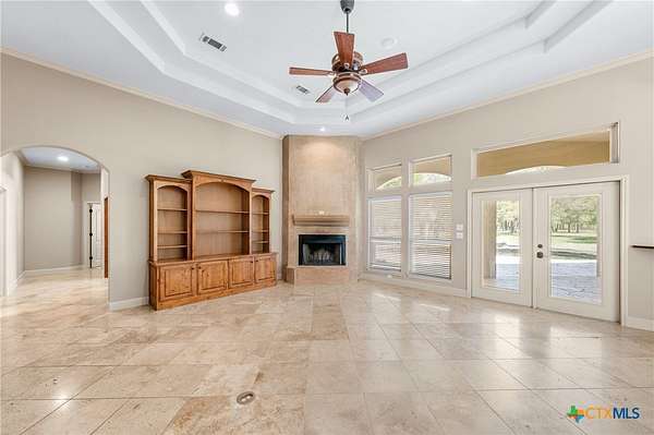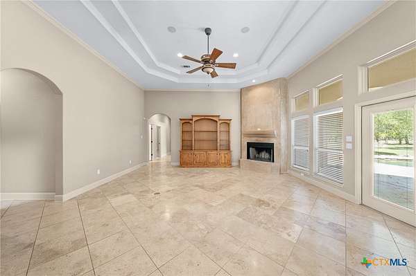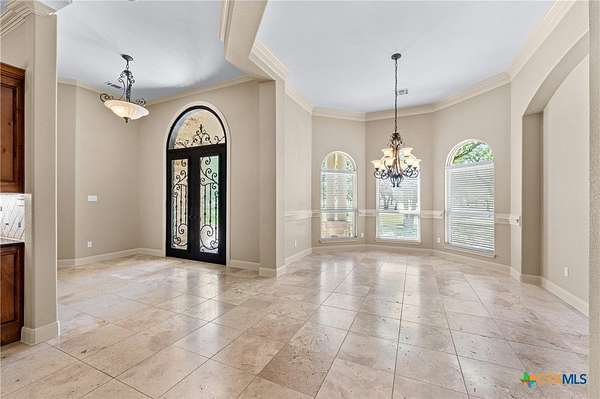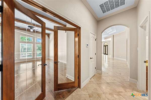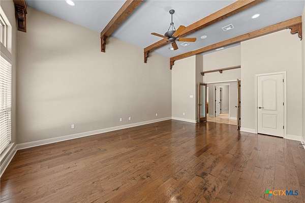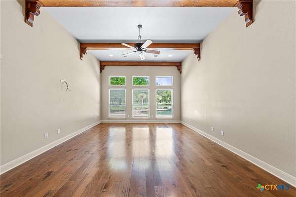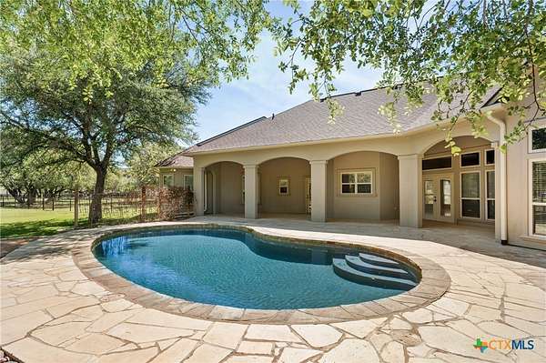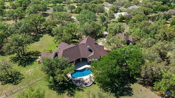 Imagine waking each morning in a beautifully maintained Hill Country estate tucked away in the coveted Hidden Springs neighborhood. Set on nearly five tree-covered acres, this exceptional property offers both privacy and space, complete with a sparkling swimming pool and a thoughtfully designed split floor plan. Inside, the home features two warm and inviting living areas, two elegant dining spaces, four spacious bedrooms, and four well-appointed bathrooms, along with a convenient four-car garage. The grand great room makes an unforgettable first impression with soaring ceilings, a striking fireplace, travertine floors, and dramatic double wrought-iron entry doors. Expansive windows flood the space with natural light and frame picturesque views of the backyard.Step outside to your own private oasis-the pool area is perfect for relaxing afternoons or entertaining guests, offering a serene retreat you may never want to leave. The generously sized kitchen is a true centerpiece, designed for both everyday living and gathering, with ample space to cook, connect, and entertain. A second living area adds character with rich wood floors, high ceilings, and beautiful exposed beams. All four bedrooms are generously sized, creating a comfortable and functional layout for modern living. Enjoy the peace and tranquility of country living while being just minutes from the charm, shopping, and dining of Salado.