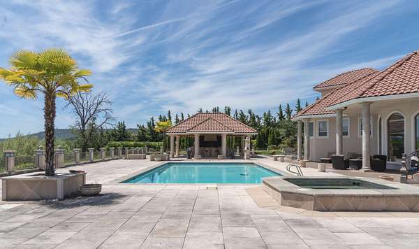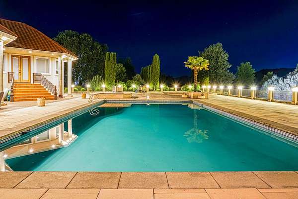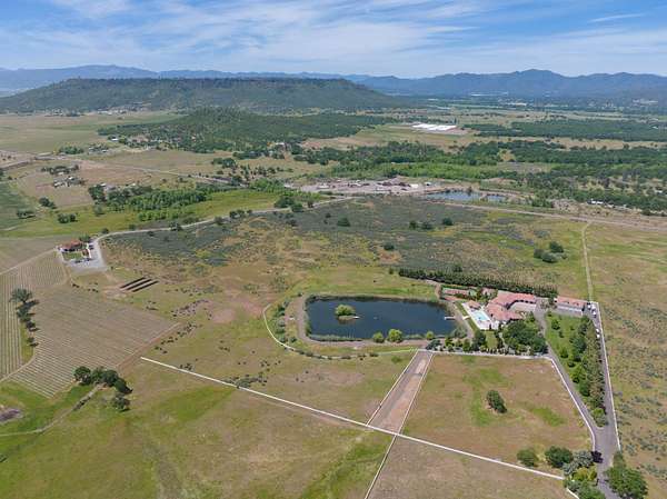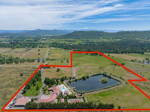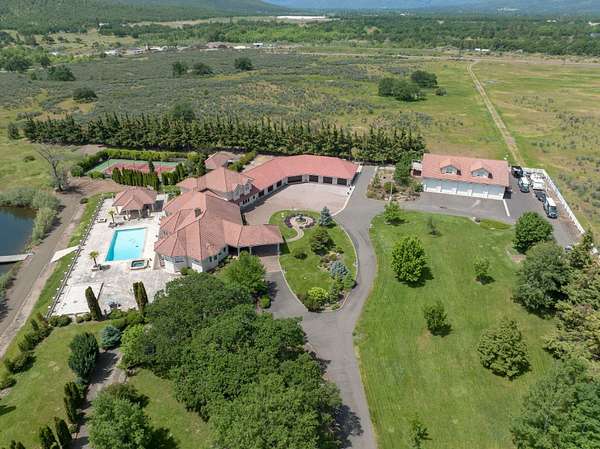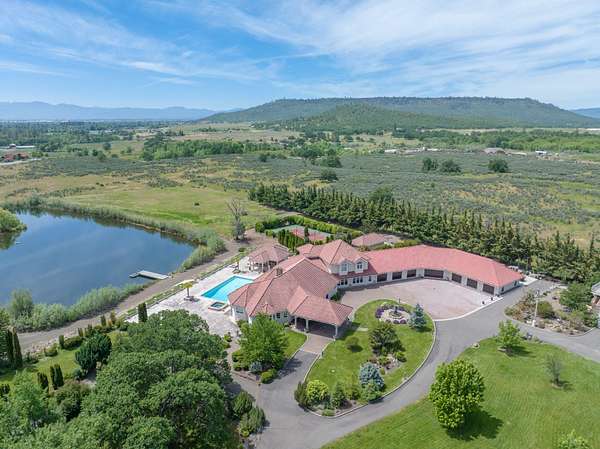 Experience this one of a kind estate! It has 40 irrigated acres with a 3 acre lake. The property has water rights. The landscape is professionally designed. The main house has 4 beds and 4.5 baths. There are 18 foot ceilings with large windows offering incredible views. The media room has a full bar. Upstairs has 3 bedrooms, 2 bathrooms, a kitchen and laundry. The travertine floors are heated. The attached garage has 7 stalls. The basement houses all of the systems, a 1200 bottle wine cellar and a walk-in safe. The French doors lead to the outdoor kitchen, saltwater pool and jacuzzi. The path takes you to an out building with a wet and dry sauna and lighted tennis court. The detached shop is 50' by 70' with 5 twelve foot garage doors. Above the shop is an office and a 2 bedroom 1 bath unit. There is a 500 gallon underground propane tank.The well produces 30 + gallons p/min. There's a 48KW propane generator. There is an easement that allows access to the Rogue river.