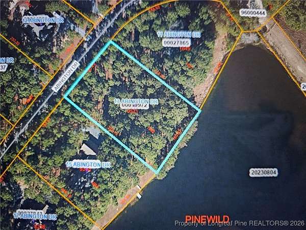 Exceptional .95-acre lakefront lot within the exclusive Pinewild Country Club community. Situated on an almost one-acre lakefront homesite with 160 feet of shoreline, 13 Abington Drive offers breathtaking water views just one mile from historic downtown Pinehurst. Enjoy the rare convenience of a 3-minute drive to shopping, dining, and everyday amenities, while still surrounded by privacy and natural beauty. This property benefits from 24/7 gated security, with a private residential entry and exit gate located just steps from the lot, providing quick and convenient access in and out of the community. Pinewild Country Club membership is optional, offering flexibility while providing access to three world-class golf courses, tennis and pickleball courts, an Olympic-size swimming pool, on-site dining, and a full calendar of social events. A rare lakefront homesite combining location, security, and lifestyle in one of Pinehurst's most desirable communities. Note: Photos 1&2 have been AI-enhanced to remove shoreline trees to better showcase the property's stunning views.