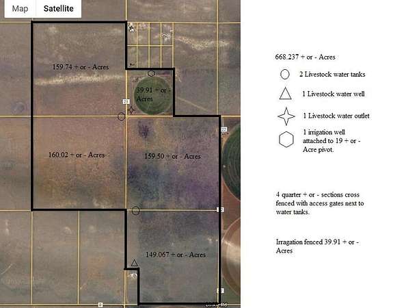Incredible opportunity to own 670 acres of productive New Mexico ranch land. Perfectly suited for self-sustaining livestock operations, this property is one of the last in the area with the capacity to grow your own feed and fully support your herd year-round.A 20-acre center pivot irrigation system is in place, ideal for hay or other forage production. The land is cross-fenced into four (4) 160+/- acre grass pastures, with two stock tanks providing water access for efficient rotational grazing. Valuable water rights convey with the property, supporting long-term agricultural use and increasing its investment potential.