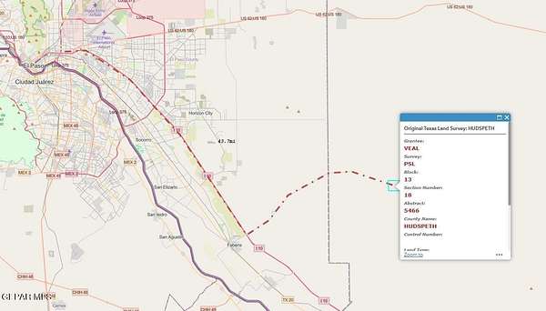 Offering a stunning mountain view and rich in wildlife, this property is conveniently close to Fort Hancock and Sierra Blanca, providing ample amenities. (Owner has a total of 40 acres for sale, 4 lots each 10 acres) (Lot 12,13,18, & 23). The land is ideal for recreational activities such as hiking, camping, and horse riding. Currently, the land is unimproved with no designated zoning for construction, and utilities are not present. However, future development has the potential to significantly enhance the property's value. The property is conveniently located approximately an hour's drive from El Paso. All images represent the surrounding area of the property. The pin location provided is an approximate indicator of the actual site. For more information call Hudspeth County.
