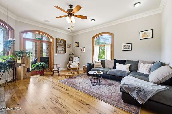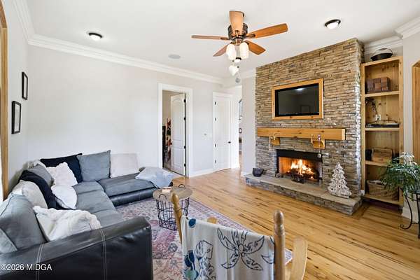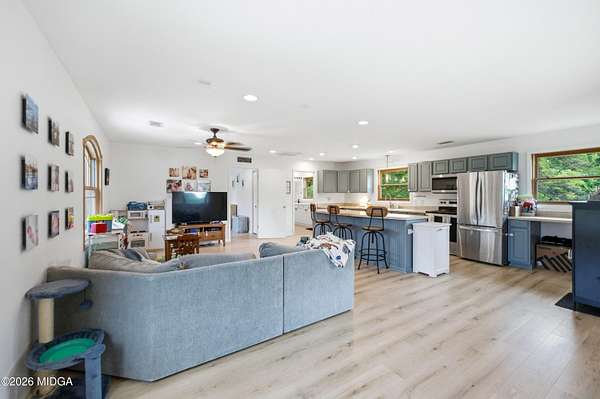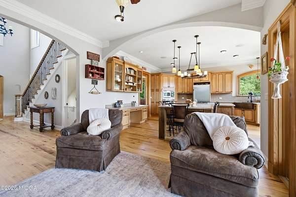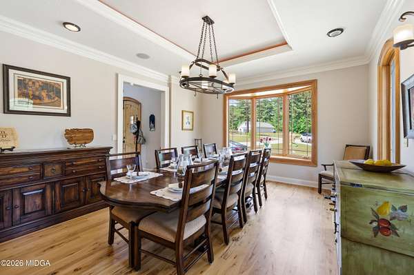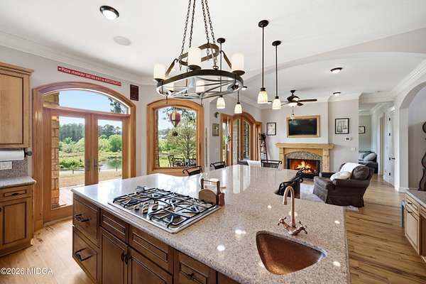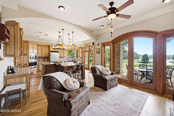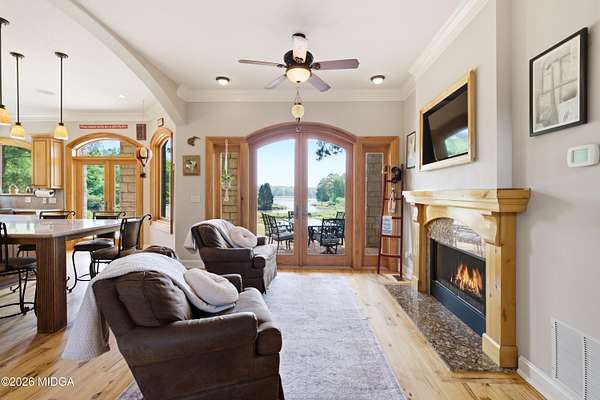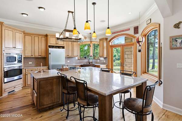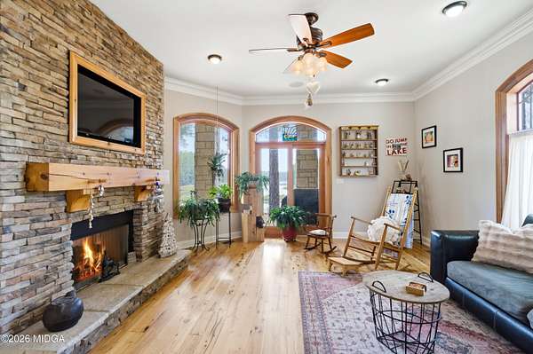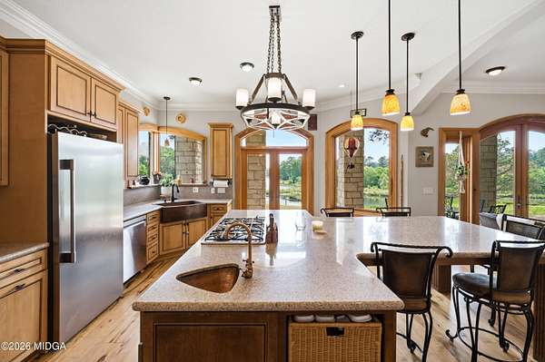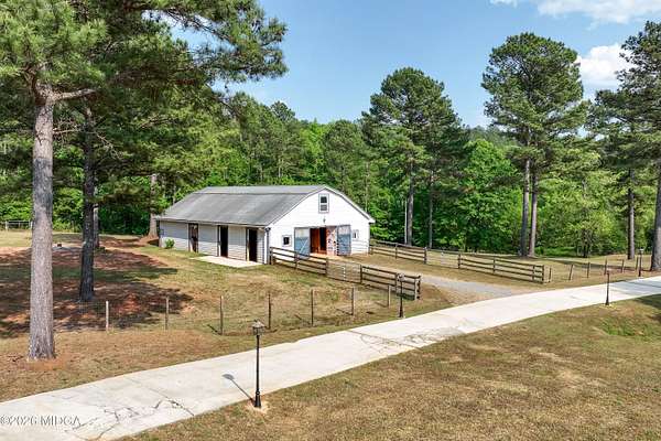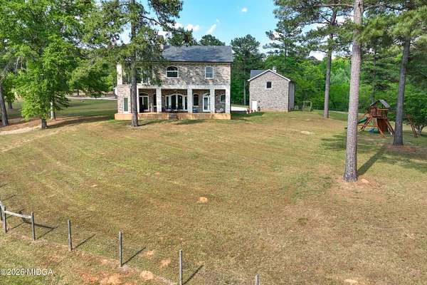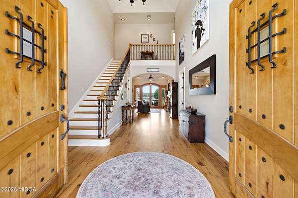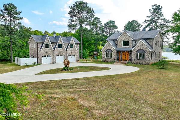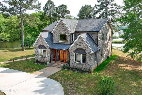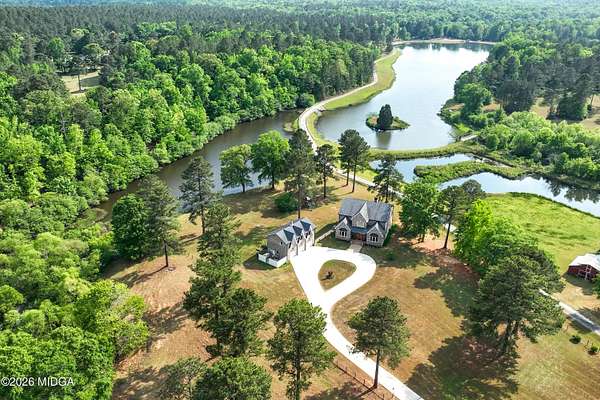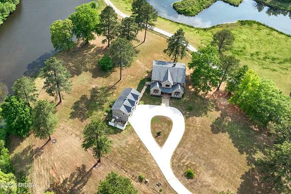 This custom craftsman-built home truly has everything you could possibly want, offering stunning lake frontage on Lake Irene and a level of quality and detail that is hard to find. From the moment you arrive, you'll notice the beautiful alder front doors and inviting front porch. Step inside to a grand 24-foot foyer ceiling that makes an immediate statement along with real pine hardwood floors. The main level features a dedicated office, along with casement windows throughout the home that allow for fresh air and beautiful views of the spacious yard and lake. Designed for both everyday living and entertaining, the home includes a zoned stereo system throughout--perfect for game nights and gatherings. The custom kitchen is a standout, featuring maple wood cabinets, a large island, a butler's pantry with a bar sink, and plenty of storage. The layout flows seamlessly into the living spaces, highlighted by a double-sided fireplace shared between the living room and den, as well as a large dining room. The oversized primary suite offers its own private balcony overlooking the lake, creating a peaceful retreat. It also features a grand walk-in closet and a spacious bathroom complete with a soaking tub and a beautifully tiled shower. Additional bedrooms include built-in desks, and there is ample attic space for extra storage. The basement is a fully poured concrete basement and includes a home movie theater, adding even more space for relaxation and entertainment. The home is also equipped with Marvin Andersen doors and windows throughout, all with a warranty, along with a central vacuum system for added convenience. Step outside to enjoy a Trex deck overlooking the lake, perfect for taking in the views. The home is topped with 50-year guaranteed EcoStar shingles, and every upgrade you could imagine has been thoughtfully included. This is not a property you could easily replicate--with the lake frontage, space, upgrades, and level of custom craftsmanship, it truly stands apart. In addition to the main home, the detached garage features a fully finished apartment above, perfect for guests, a mother-in-law suite, or older children. For those needing even more functionality, the barn is fully equipped for horses and includes a paddock, making this property ideal for equestrian use as well. Everything you could imagine is here--this house truly has it all.