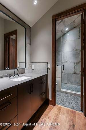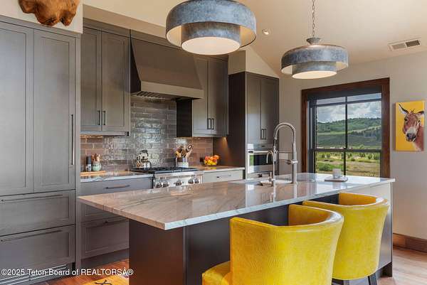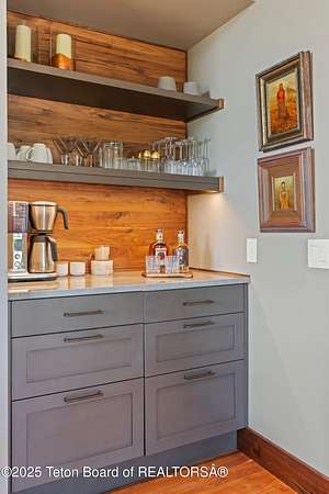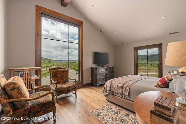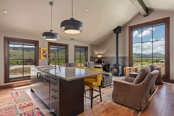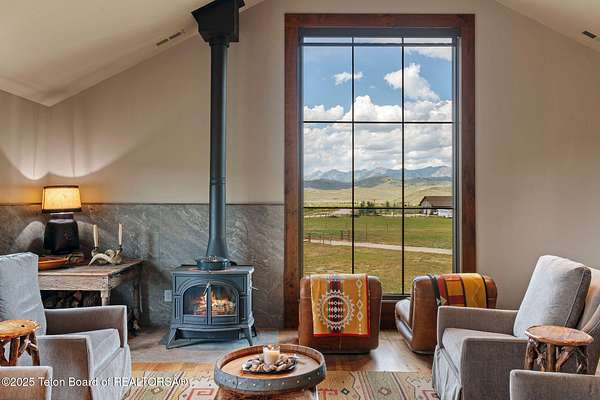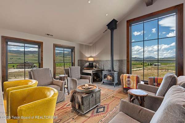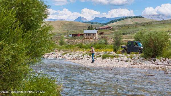 Discover your ideal Wyoming retreat on 9.6 acres with direct Hoback River and National Forest access for fishing, hiking, and outdoor adventure. This custom fieldstone barndominium blends rustic charm with modern comfort. The upper-level living area features central air, forced air heat, a wood-burning stove, hardwood floors, wood clad Marvin windows, and a Downsview kitchen showcasing Wolf and Sub Zero appliances and a coffee bar in an open-concept design ideal for entertaining. The oversized 2-stall garage on the lower level features custom high-end wood paneling, a 3/4 bath, and bunk room, and can be converted into additional living space, a game room, or workshop. Set on a scenic plateau, it can be the perfect home for two or an excellent guest house while you build your main home.