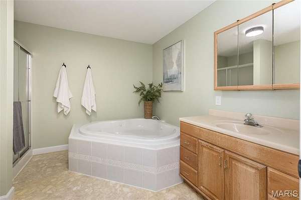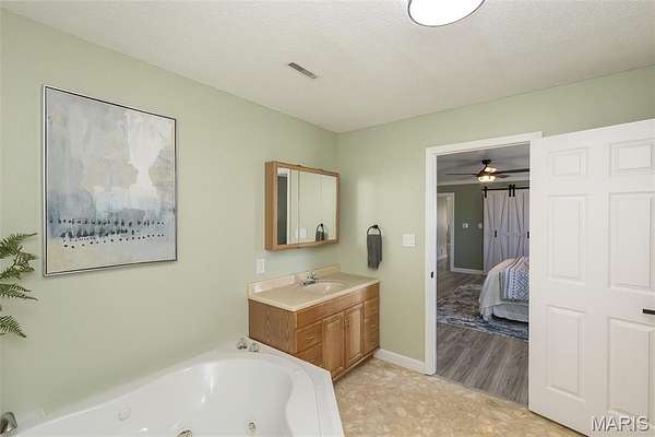 - Breakfast Bar, Ceiling Fan(s), Custom Cabinetry, Eat-In Kitchen, Entrance Foyer, Kitchen Island, Open Floorplan, Separate Dining, Separate Shower, Storage, Tub, Whirlpool