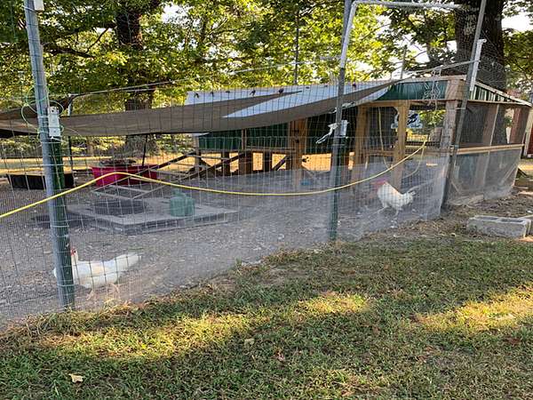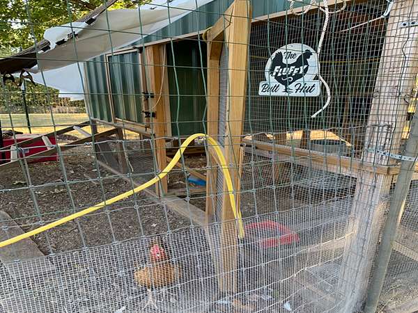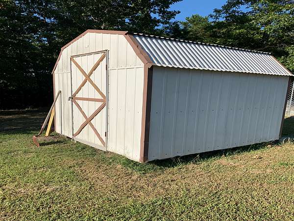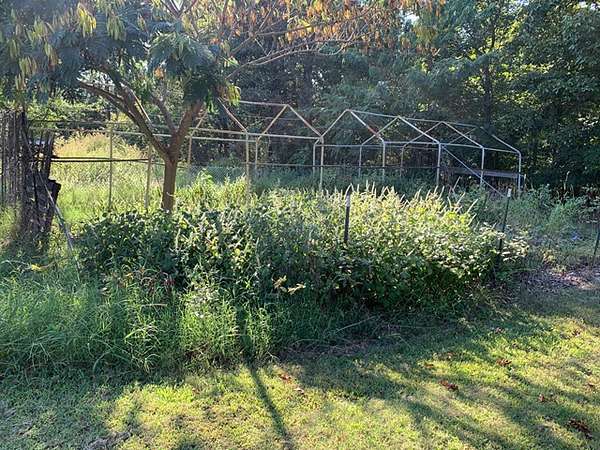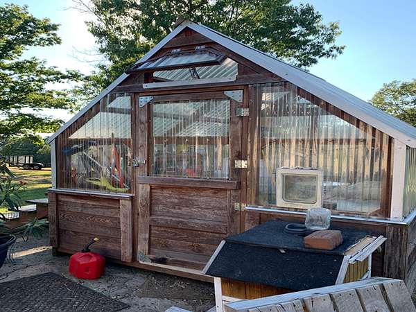 There are two storage buildings, a metal barn, a wooden barn, a chicken house with fenced run and there is a greenhouse.