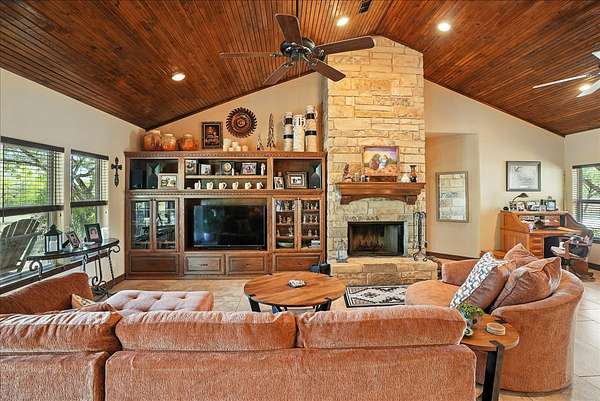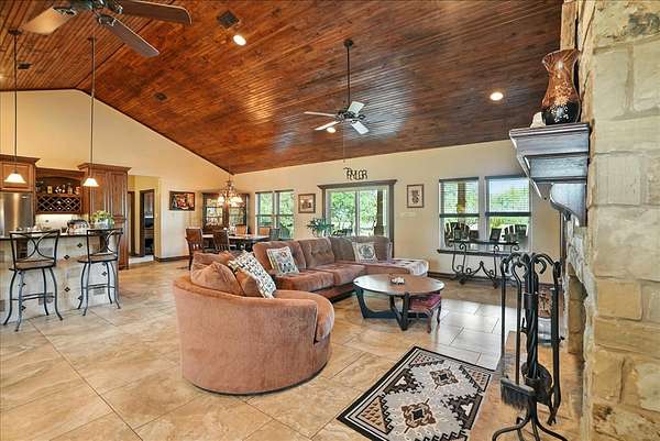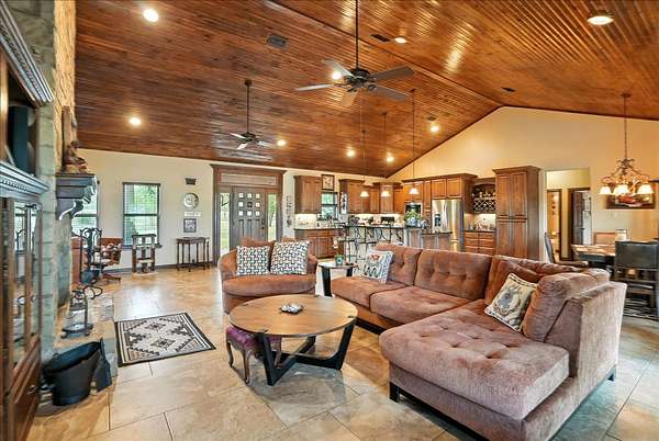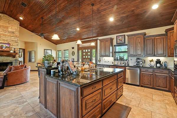 Inside, the heart of the home is an open concept living area designed for gatherings. The chef's kitchen features granite countertops, stainless steel appliances, a large island with built-in cooktop, and abundant counter space for meal prep or casual entertaining. The kitchen flows seamlessly into the spacious living room, where a floor-to-ceiling rock wood-burning fireplace serves as a stunning focal point. To one side of the fireplace, a custom built-in bookshelf adds both character and functionality.
