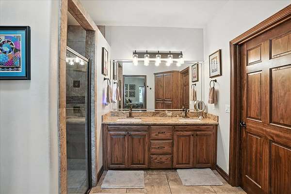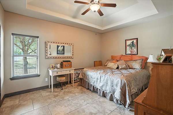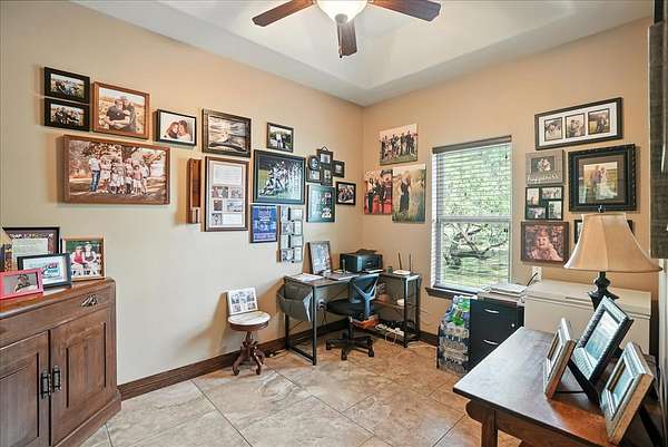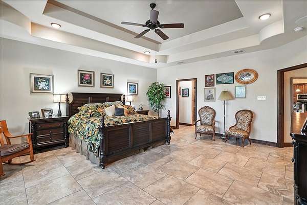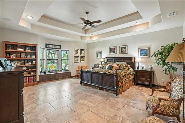 The home's three bedrooms each feature custom tray ceilings for added elegance. The primary suite is a private retreat with an oversized walk-in shower, plus a generous walk-in closet with built-in drawers.