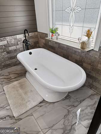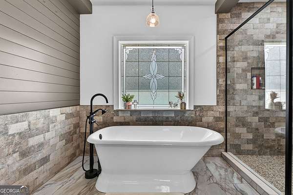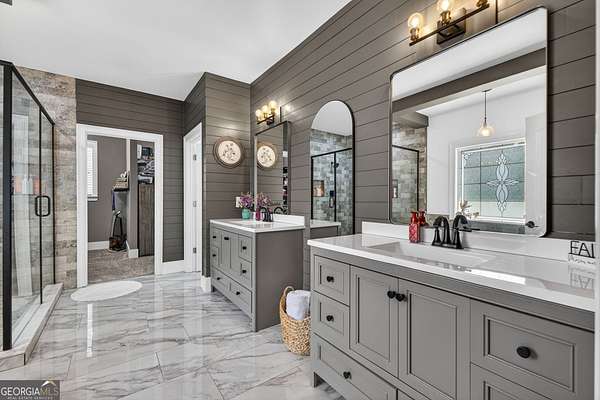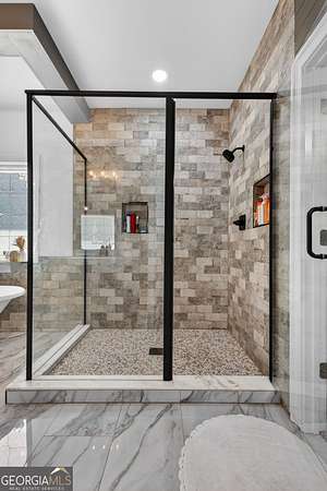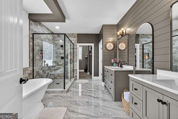 - Double Vanity, Entrance Foyer, High Ceilings, In-Law Floorplan, Master On Main Level, Sauna, Separate Shower, Soaking Tub, Tile Bath, Tray Ceiling(s), Walk-In Closet(s)