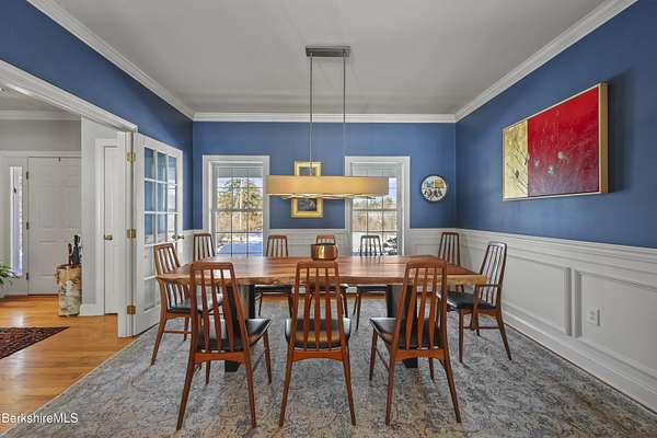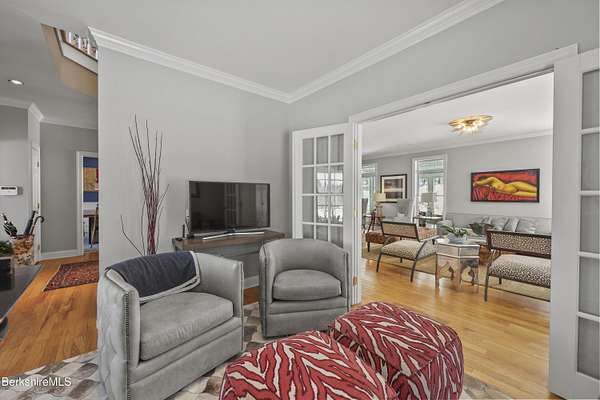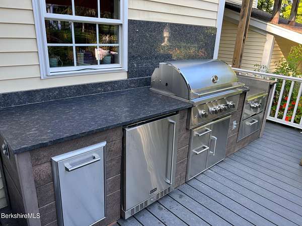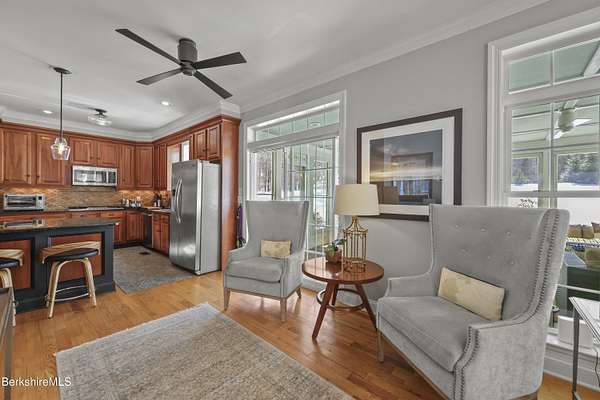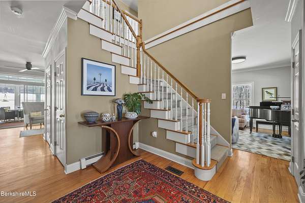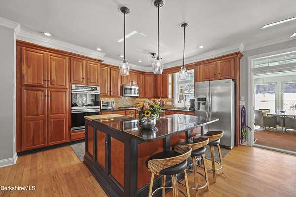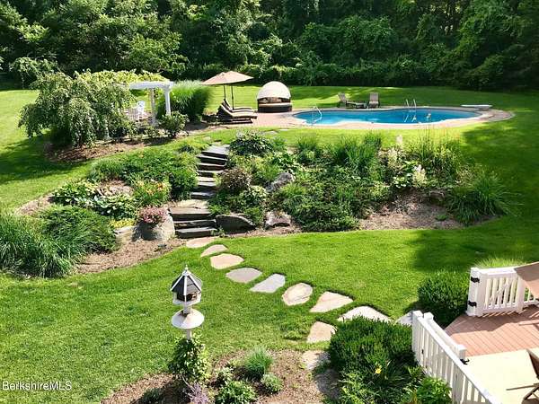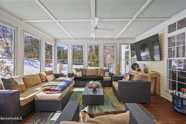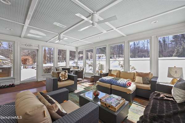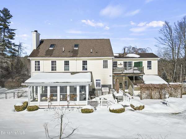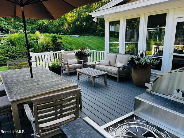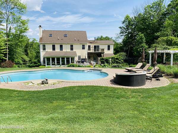 Two beautifully landscaped acres with perennial gardens blooming throughout the season. An exceptional 10-room home offers privacy, views, and effortless Berkshire living just minutes from downtown Lenox and Tanglewood. The home features an open and inviting layout with a fireplaced living room and a chef's kitchen designed for gathering and entertaining. A stunning four-season sunroom transitions to a screened porch in the warmer months, allowing you to enjoy the surrounding landscape year-round. Four bds, + office/den, & 3.5 bths, allows ample space for family/guests. Primary suite offers a peaceful retreat w/ modern bth & private deck w/ hot tub. Outdoor is a spacious deck, built in kitchen & in-ground pool, + a 2 car garage w/elec charger. Beauty, privacy and convenience.