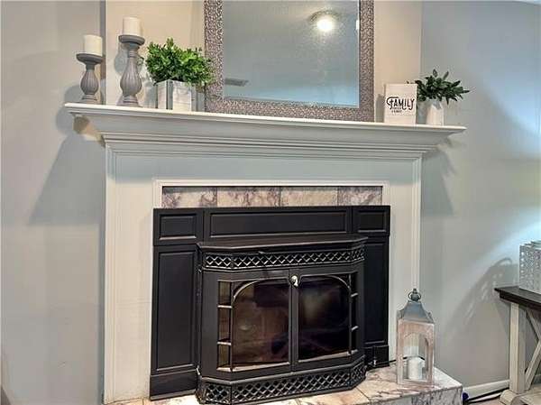 The kitchen is well-appointed with a large island, quartz countertops, double oven, ice maker, dishwasher, refrigerator, and abundant cabinetry, making it ideal for everyday living and entertaining. Just off the kitchen is a formal dining room. The living room features a Vermont Castings fireplace insert, providing warmth and character.