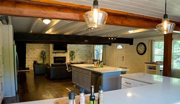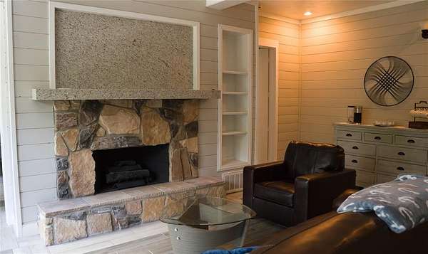 Open-concept living and dining area with cozy fireplace and floor-to-ceiling windows