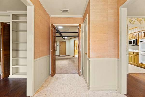 This rare opportunity features a 3,922 sf one-story home nestled on three scenic acres shaded by mature pine, cedar, and oak trees in a well-established neighborhood just outside Tyler city limits. Enjoy privacy, space, and a peaceful setting while staying close to town. Designed by the original owner and lovingly maintained by one family, this home was built with pride and solid construction--truly wonderful bones. The spacious layout includes a large family room near the kitchen, a generous game room with wet bar for entertaining, and formal living and dining areas at the entry. The formal living space easily doubles as a study or flex room. A thoughtful split-bedroom design offers a private bedroom and full bath with its own entrance, ideal for multigenerational living, guests, a home office, or a future primary retreat. While much of the home remains true to its original design, recent updates include roof, carpet, and wood flooring. Custom built-ins, expanded closets, abundant storage, and charming custom shutters add character and functionality throughout. The neighborhood is known for its beautiful, unique ranch-style homes with space between neighbors. Outdoors, the land offers endless potential for landscaping, horses or other animals, play areas, or future additions like a pool, tennis court, horse arena, or putting green. This home is a true private retreat with incredible potential--peaceful country living just minutes from everything Tyler has to offer. Adjacent wooded 6-acre parcel that backs to 275 Glascow Rd is for sale - TBD Surrey Trl - see MLS 21178442.