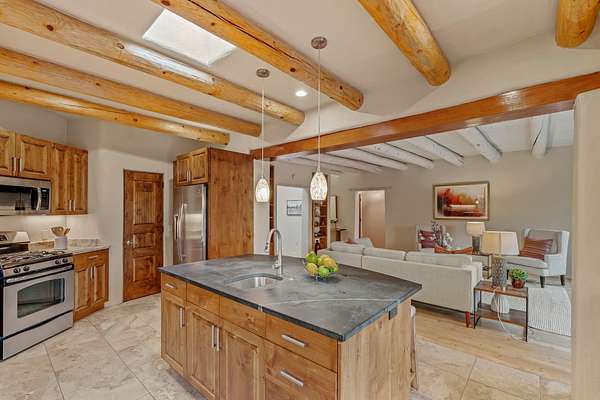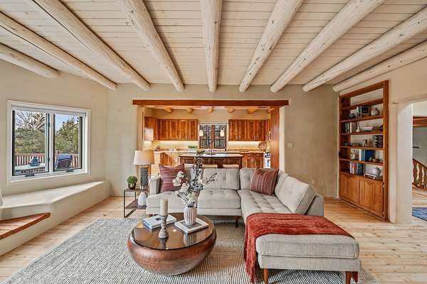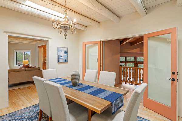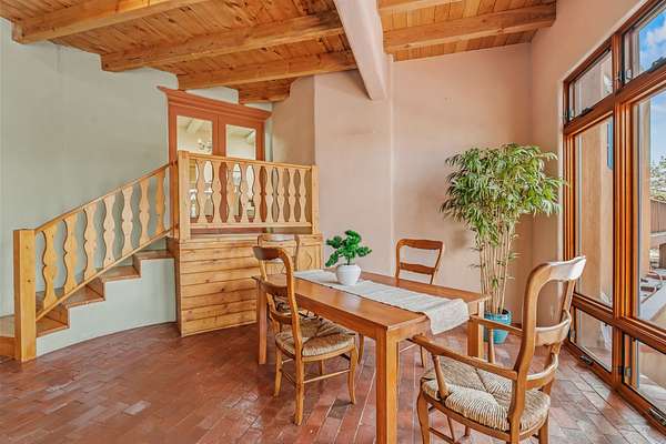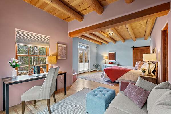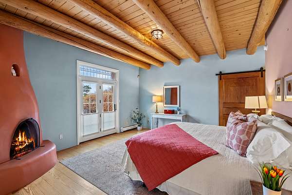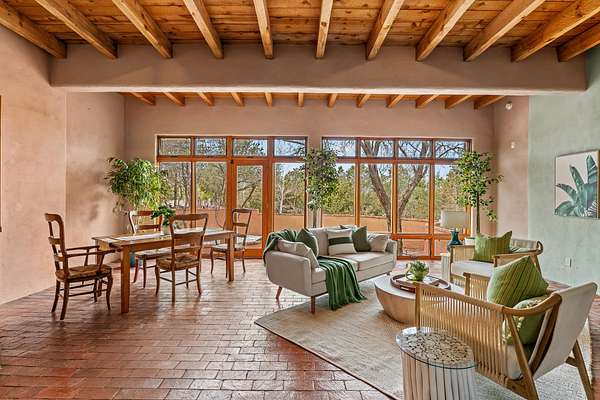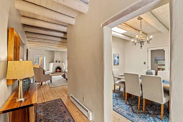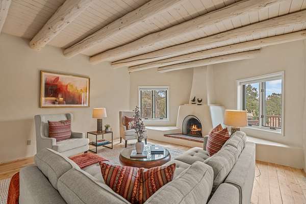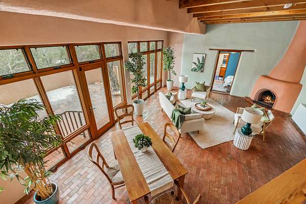 1300 Lejano Lane is a timeless Santa Fe retreat blending classic adobe charm with exceptional indoor-outdoor living. The 2,904-square-foot main residence, constructed of adobe and frame, showcases rich architectural detail and inviting spaces designed for both relaxation and entertaining. The spacious living room features knotty pine wood floors, exposed vigas, and a dramatic kiva fireplace, opening seamlessly to the kitchen. Just beyond, an outdoor deck overlooks the heated pool and hot tub, creating an effortless flow for gatherings. A separate dining room connects to the private guest wing and a light-filled sunroom with brick floors, beamed ceiling, kiva fireplace, and French doors leading to a bricked patio. The primary suite is a true sanctuary, complete with its own Owner's Lounge and kiva fireplace, Douglas fir floors, French doors to an enclosed patio, walk-in closet, double-sink vanity, walk-in shower, and mini-split for year-round comfort. The ensuite guest bedroom also offers a kiva fireplace and French doors to the back patio, near an exterior spiral staircase leading to a rooftop deck. A heated art studio/bonus room with cabinetry, utility sink and private entrance connects to the oversized two-car garage, offering ideal flex space for a gym or creative studio. The beautifully landscaped grounds include brick and natural landscaping, an orchard with apple, pear, apricot, cherry, and a jujube tree, plus two 2,500-gallon water catchment systems irrigating aspens and fruit trees. The heated pool (approx. 15' x 33') ranges from 3.5 to 8.5 feet deep. A charming teepee adds character. A separate all-adobe guesthouse, with it's own private gated entry, features vigas, Saltillo tile, kiva fireplace, full kitchen, dedicated laundry, one bedroom, and a full bath, perfect for guests or rental potential.
