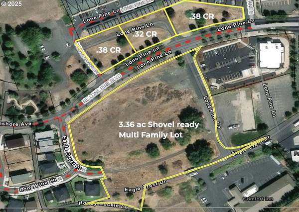 Est $2,161/mo.38 acre flat, Commercial Recreation lot for sale in Lone Pine development, The Dalles. Flexible zoning allows for many commercial uses. Water and electricity are to the site. Sewer is in the street. Sidewalks, curbs and gutters are in. Last commercial lots in this mostly built out neighborhood. Easy access and visibility from Hwy 84. Adjacent to Rivers Edge Medical, Starbucks, McDonalds and Comfort Inn. Phase 1, traffic analysis, and utility base map available. There are 2 additional small lots available and one 3.36 acre shovel ready lot available.